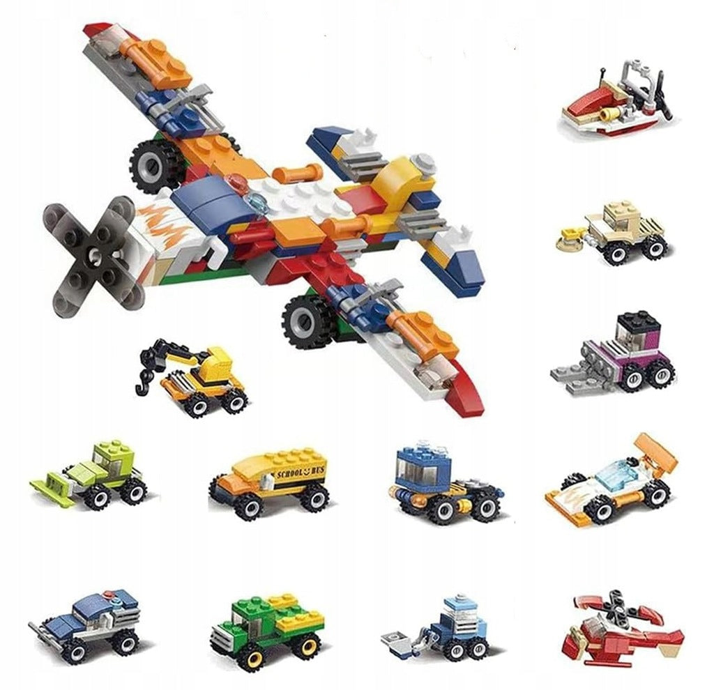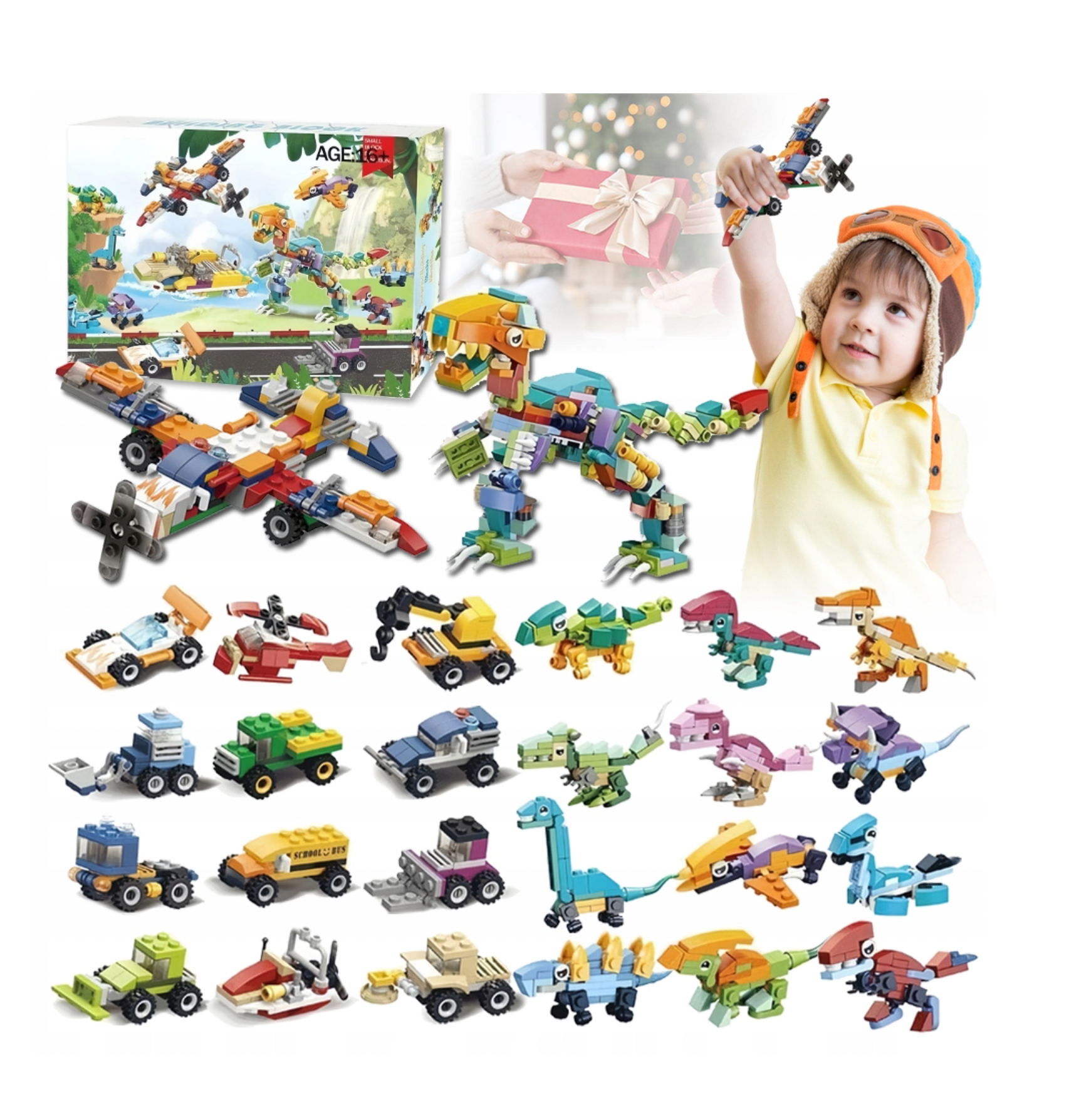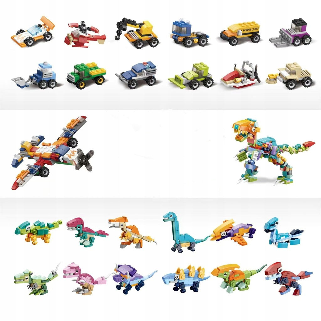 Rinkinyje 12 transporto priemonių ir 12 dinozaurų. Kiekvienas blokas yra atskiras paketas ir pateikiamas su spalvingomis instrukcijomis.