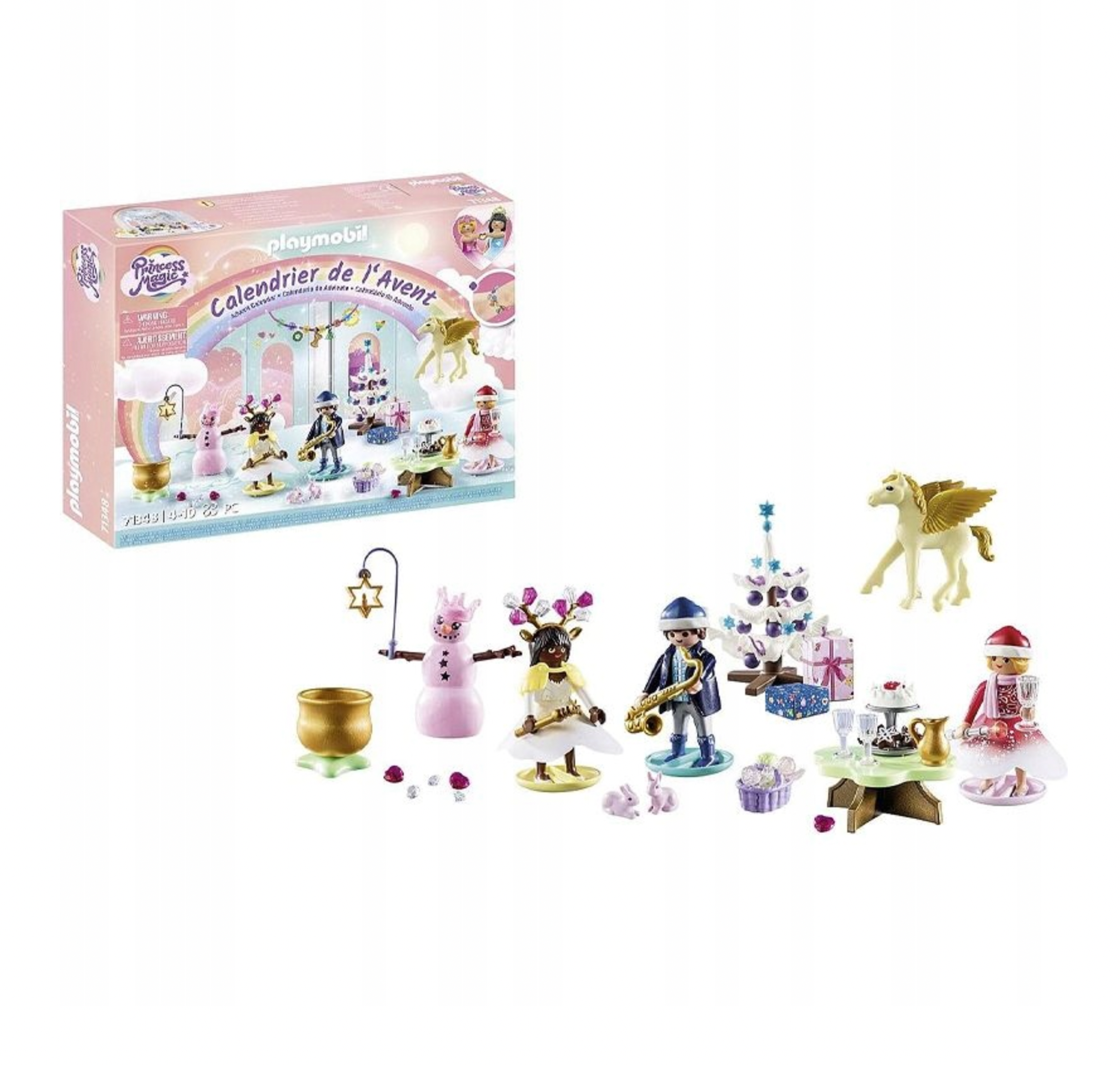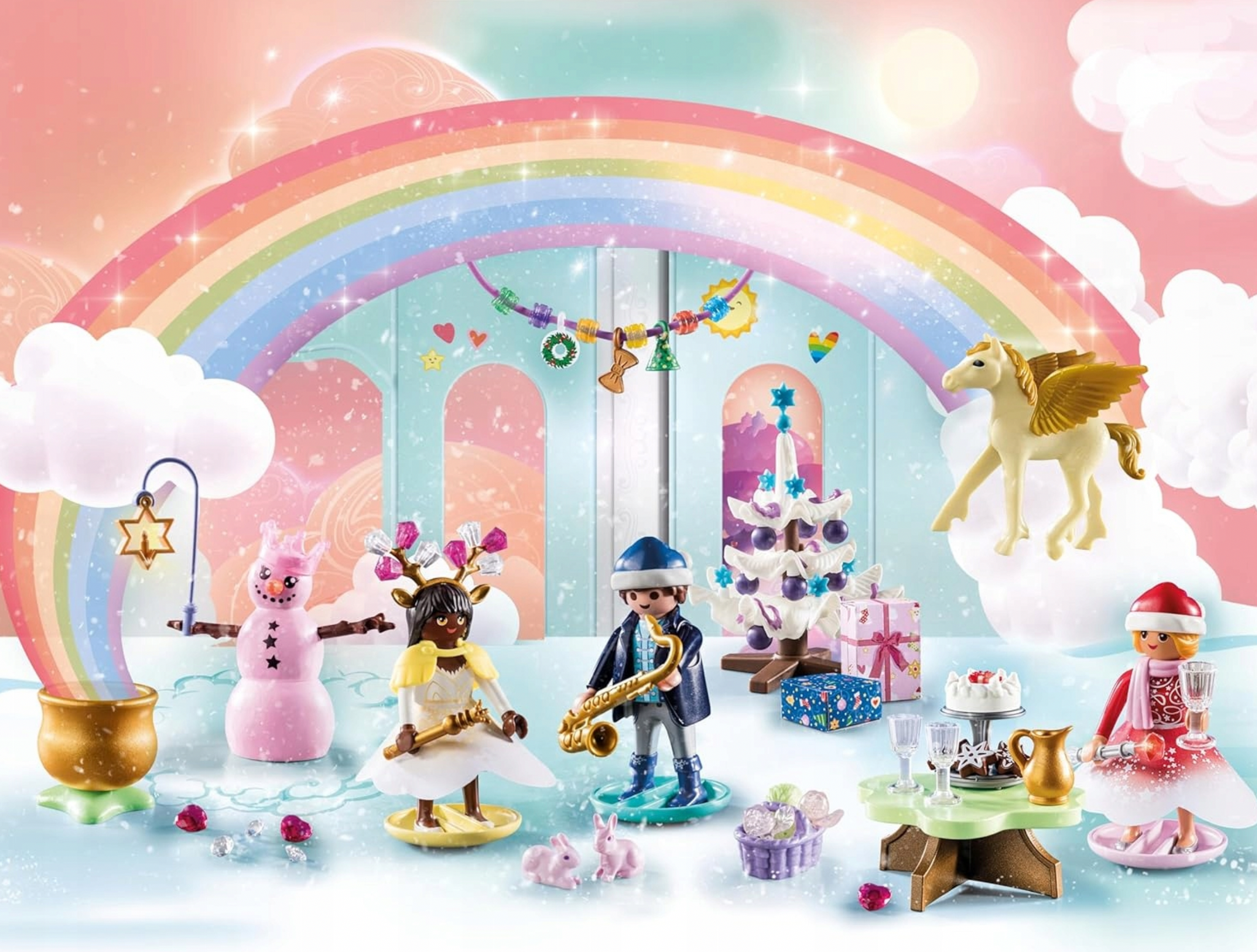 Į komplektą įeina papuošta eglutė su dovanomis ir stalas su gardžiu maistu. Kol princas groja kalėdines giesmes saksofonu, princesės šoka. Pridedama unikali apyrankė su kalėdiniais žavesiais, kuri gali tapti ir girlianda. Figūrėlės: 2 princesės, 1 princas ; Gyvūnai: 2 triušiai, 1 pegasas; Aksesuarai: 2 debesų sijonai, 2 apatiniai sijonai, 2 sąsagos, 2 kalėdinės kepurės, 1 šalikas, 1 ragas, 2 skeptrai, 3 verpalai, 1 stalas, 1 grafinas, 3 stiklinės, 1 lentyna, 1 žvaigždučių pyragas, 3 meduoliai sausainių žvaigždės, 1 eglutė su dekoracijomis, 2 dovanos, 8 papuošalai su deimantais, 1 silikoninė apyrankė, 1 eglutės pakabukas, 1 lankelis, 1 kalėdinis vainikas, 6 apyrankės karoliukai, 1 sniego besmegenis su šakelėmis ir morkų nosimi, 1 karūna, 1 žvaigždės žibintas su rankena, 1 auksinis gėlių vazonas, 3 deimantai, 3 deimantinės širdelės, 1 saksofonas, 1 krepšelis, 1 žolė, 2 obuoliai, 1 vaivorykštės pilies diorama.