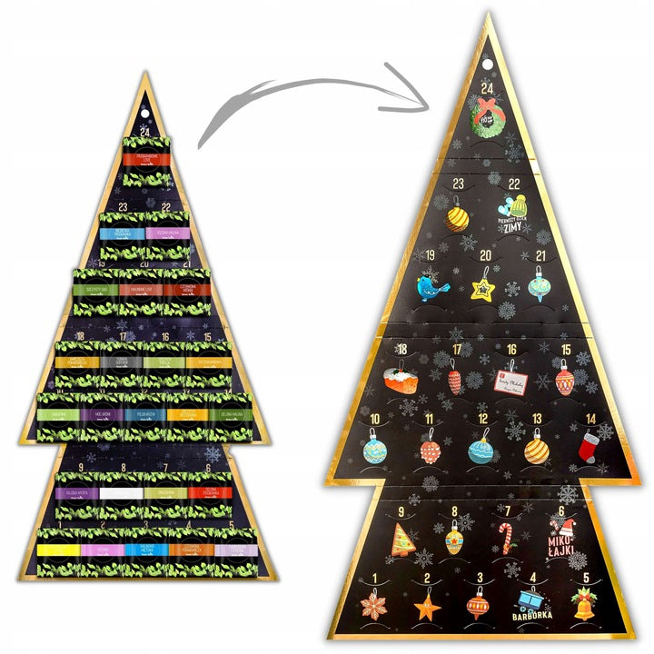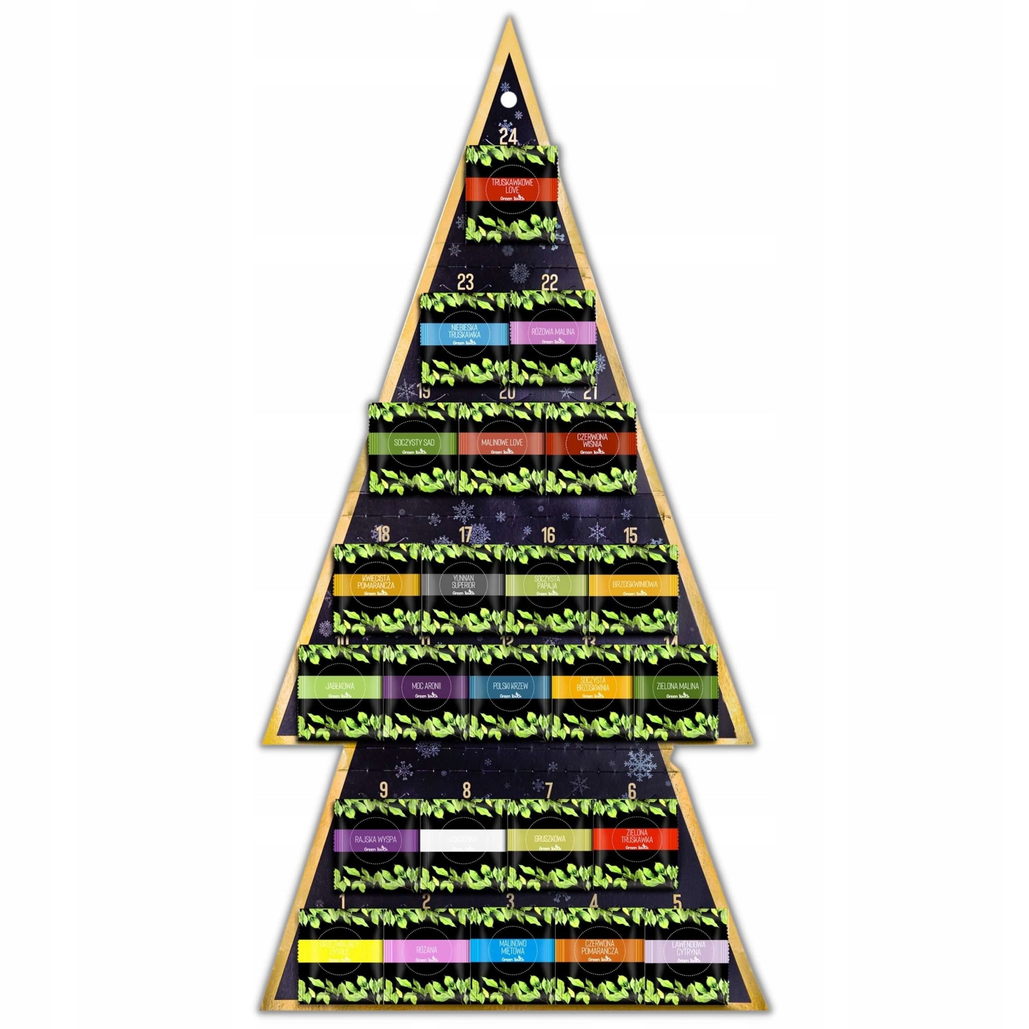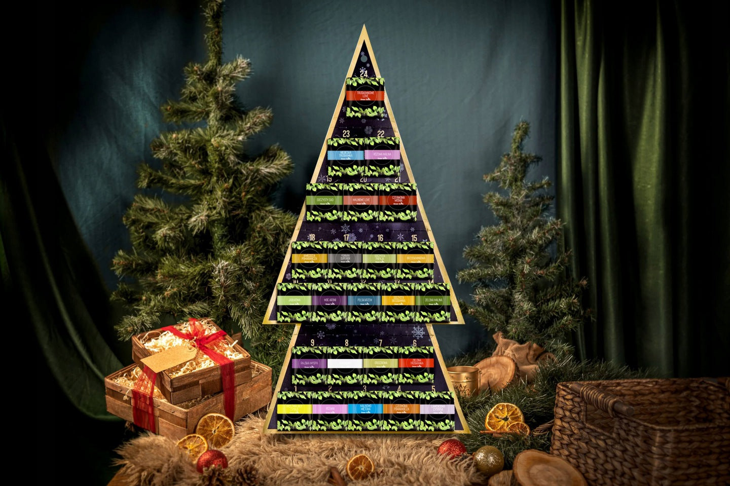 Arbatos pakeliai, sudėti į unikalų Kalėdų eglutės formos kalendoriaus.