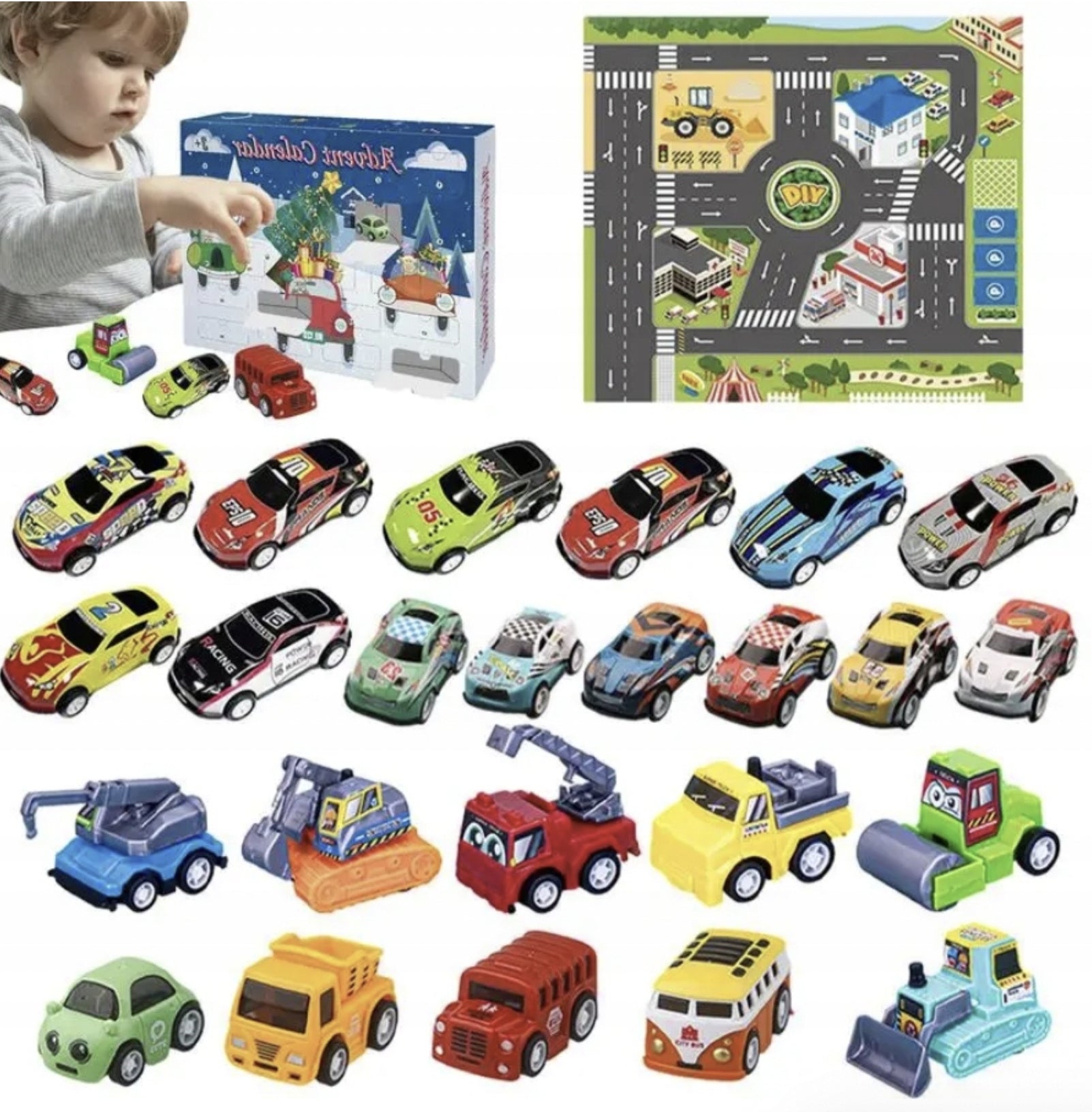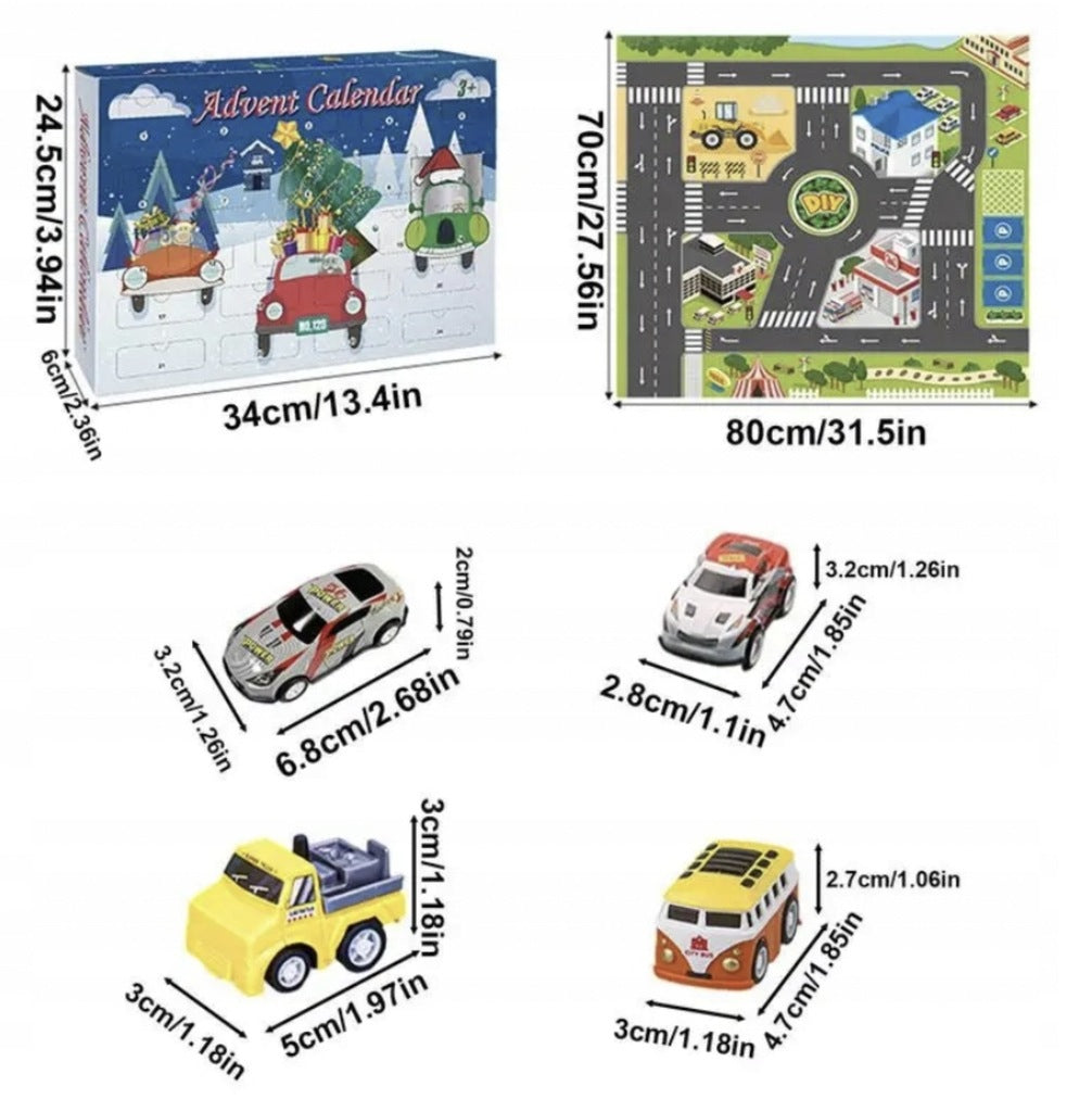Į komplektaciją įeina: kalendorius, 24 automobiliai, vairavimo kilimėlis