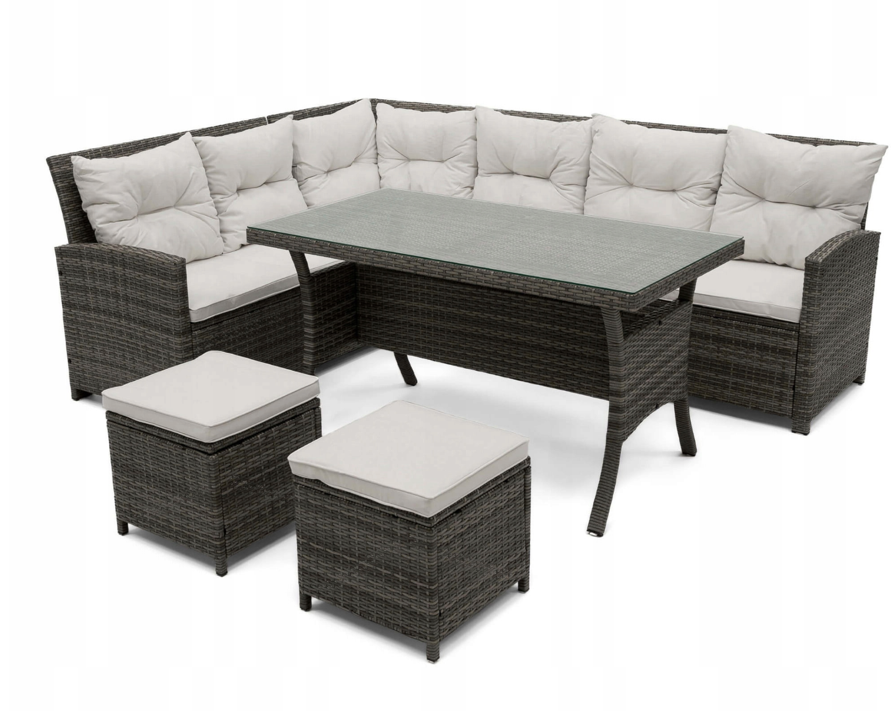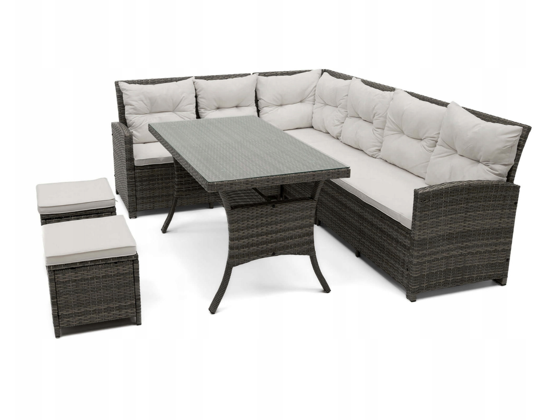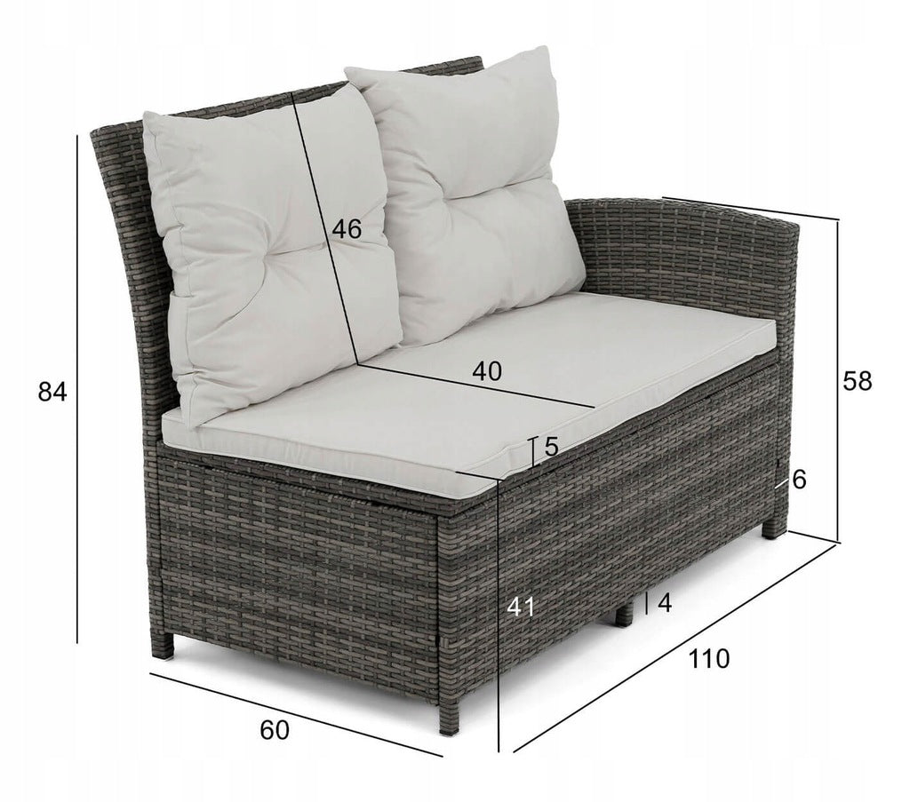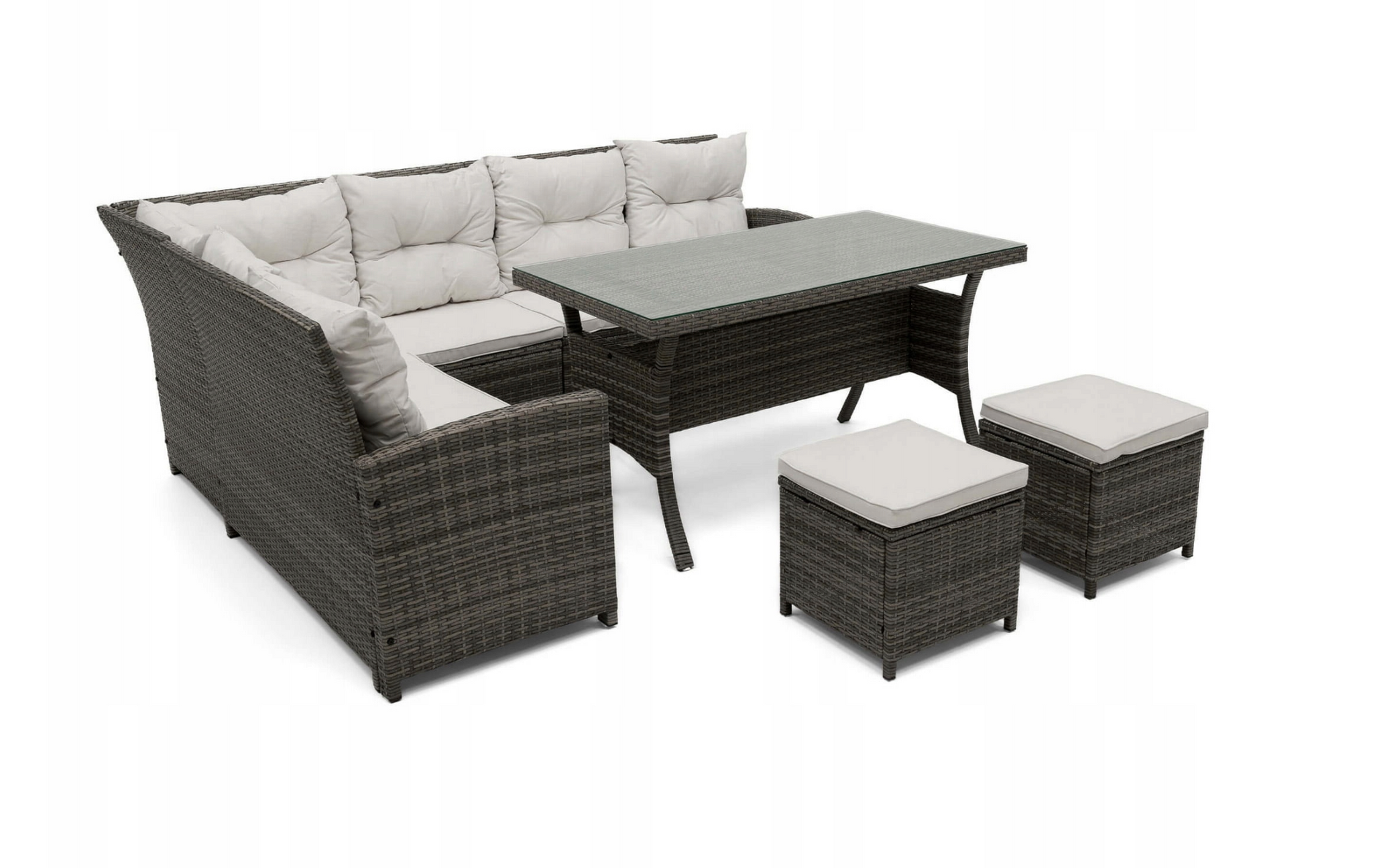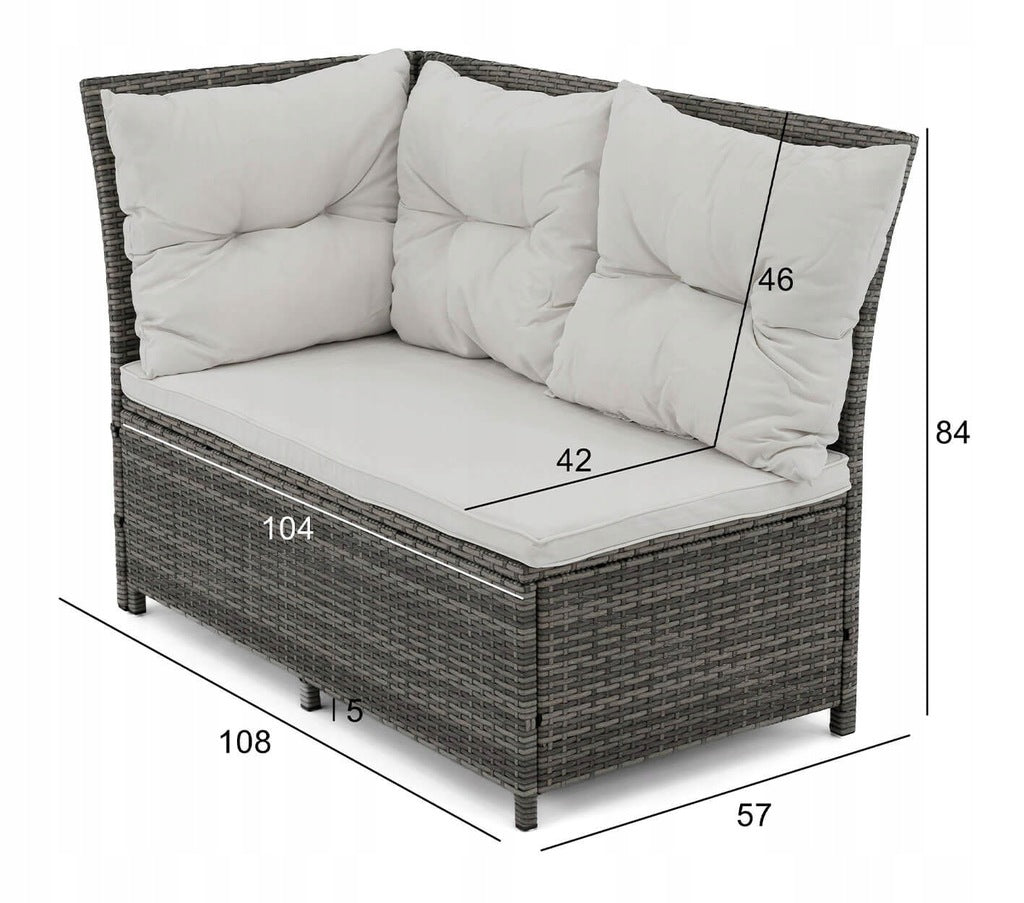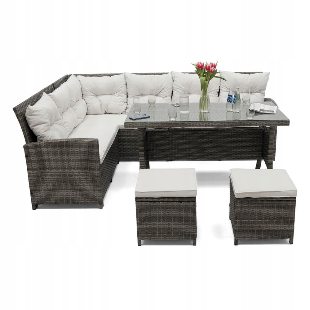 Šis sodo komplektas yra vienas iš didesnių, nes jame telpa iki devynių žmonių. Pagamintas iš labai aukštos kokybės medžiagų, atsparių oro sąlygoms. Rinkinį sudaro didelė kampinė sofa, du pufai ir didelis stalas. Kampinė sofa susideda iš trijų elementų, todėl galima bet kokia konfigūracija ir gali būti naudojama kaip maža sofa. Komplektas tinka įvairaus tipo sodams.