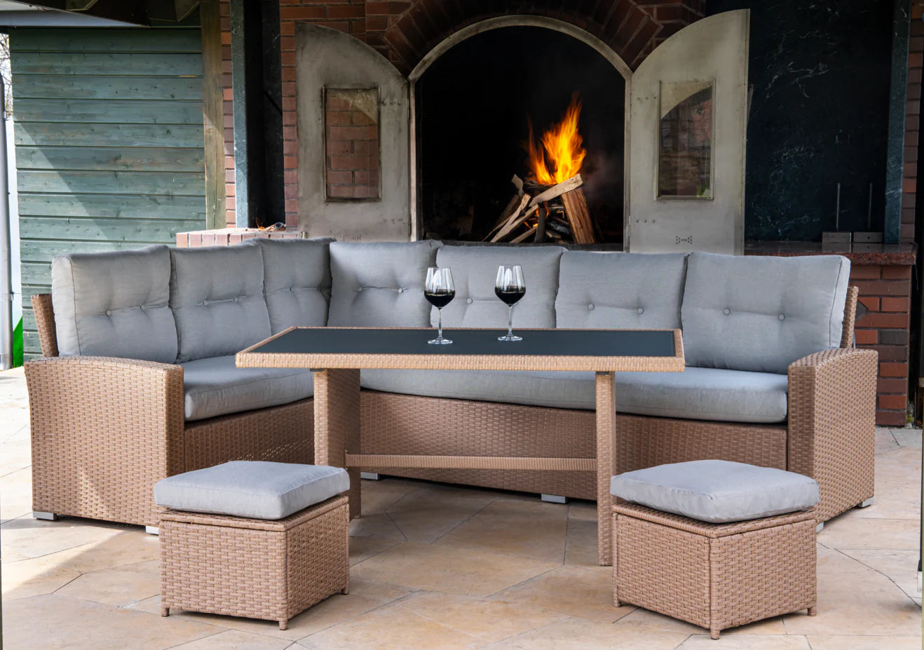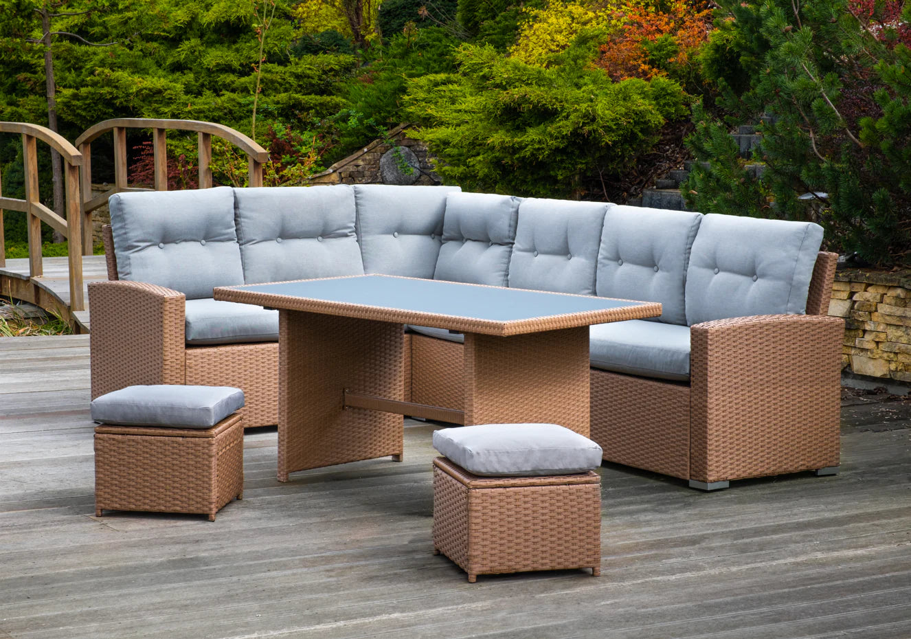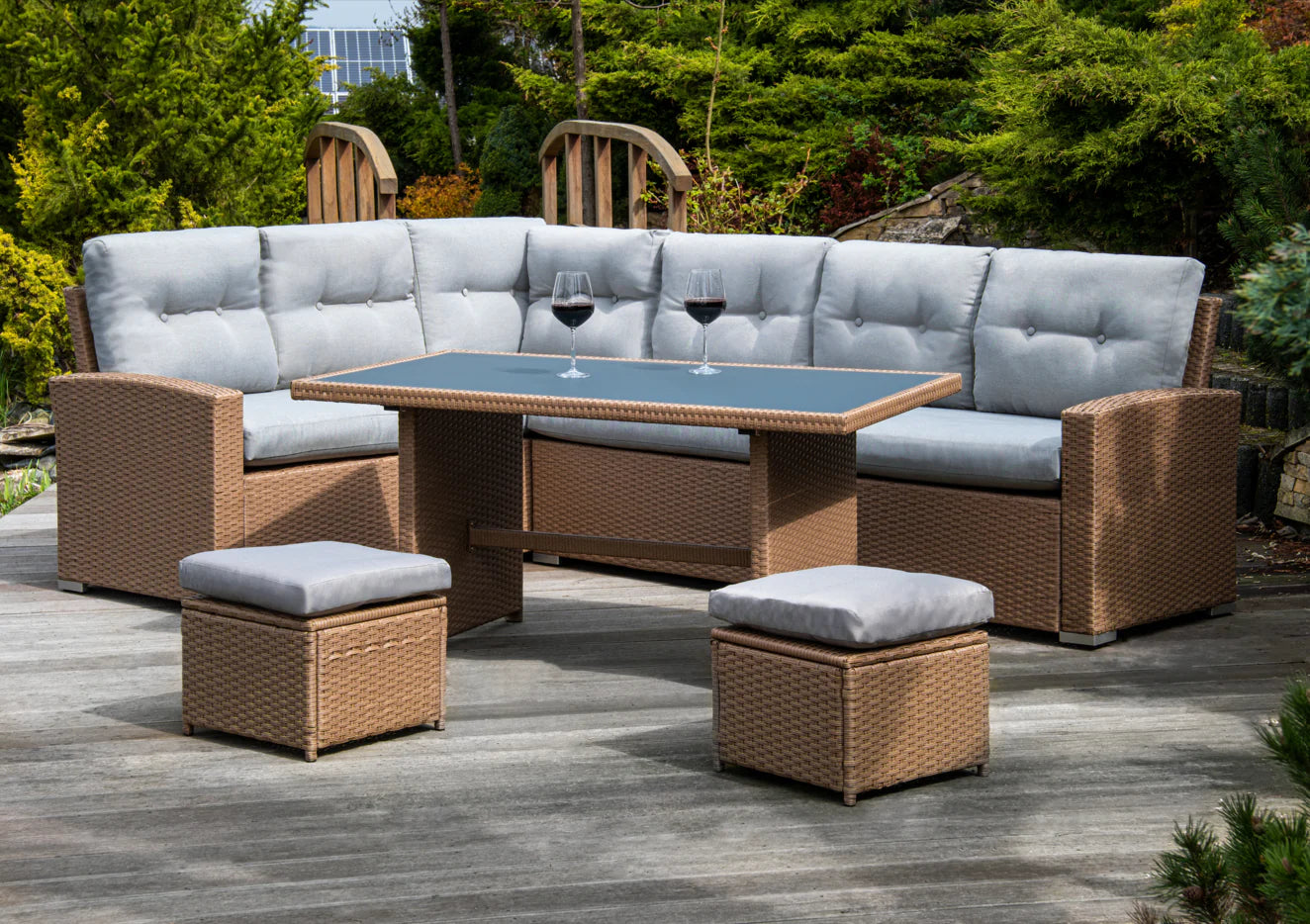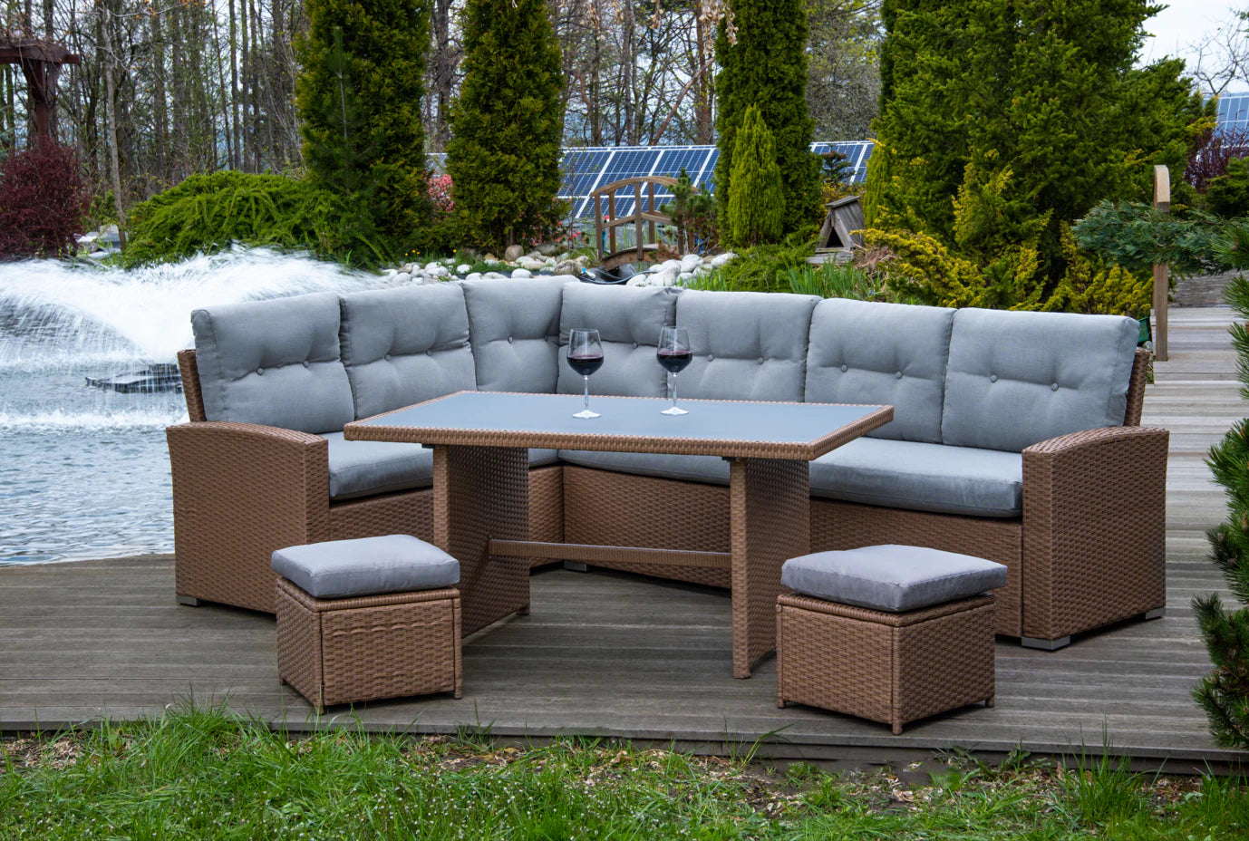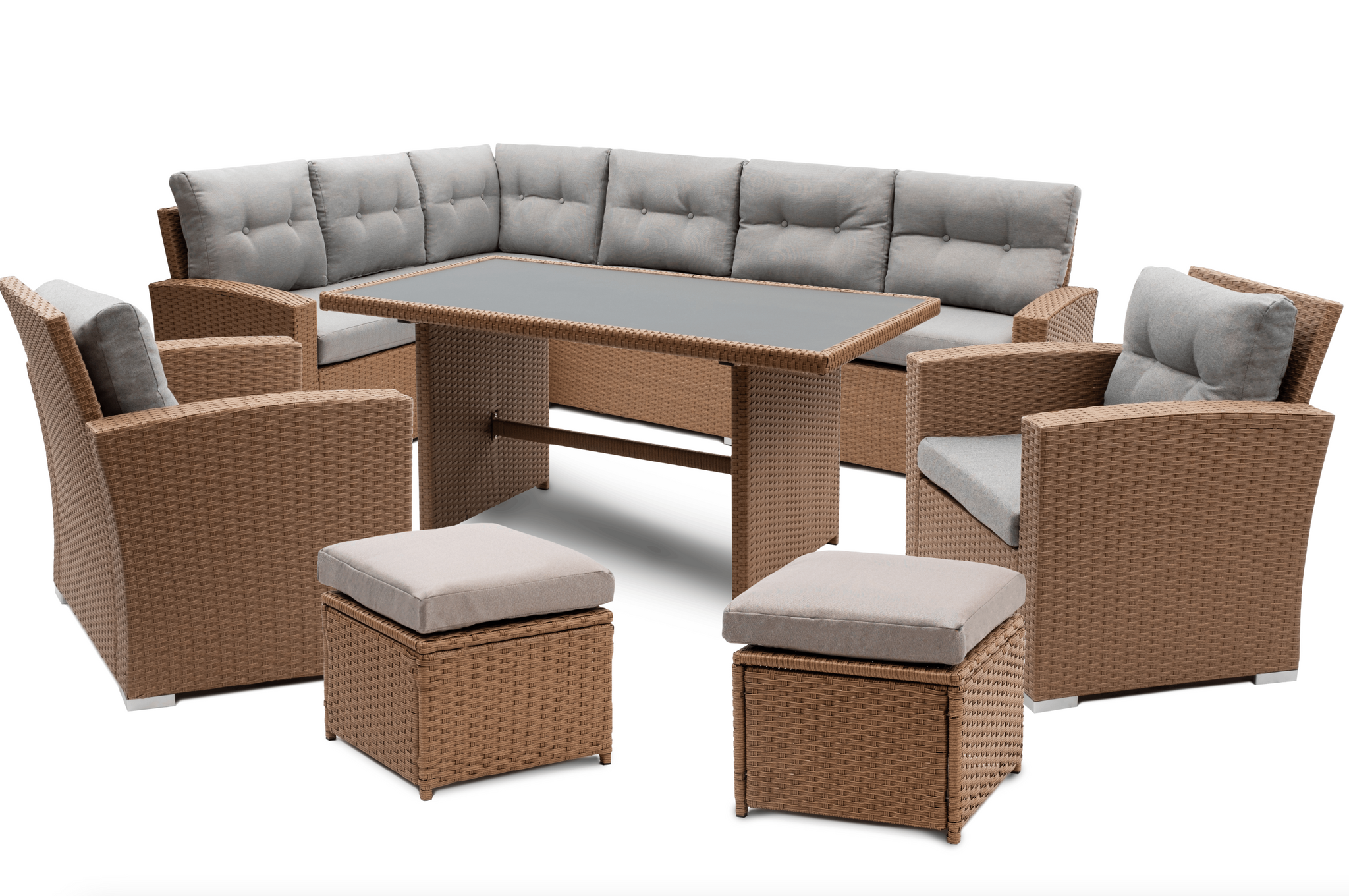 Į komplektą įeina - 1 stalas, 6 vietų kampinė sofa, 2 pufai, 2 foteliai ir sėdimųjų bei atlošo pagalvėlių komplektas.