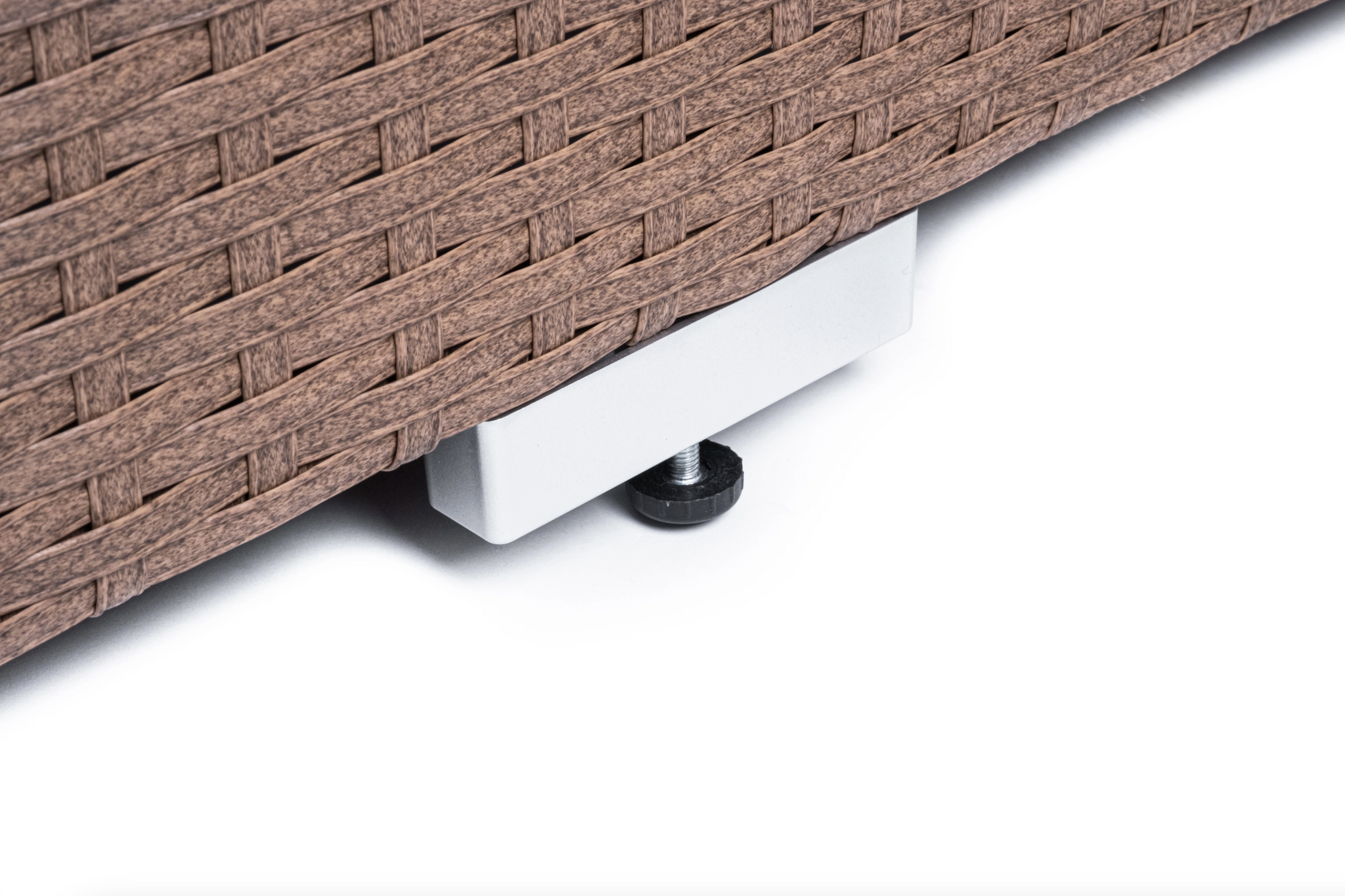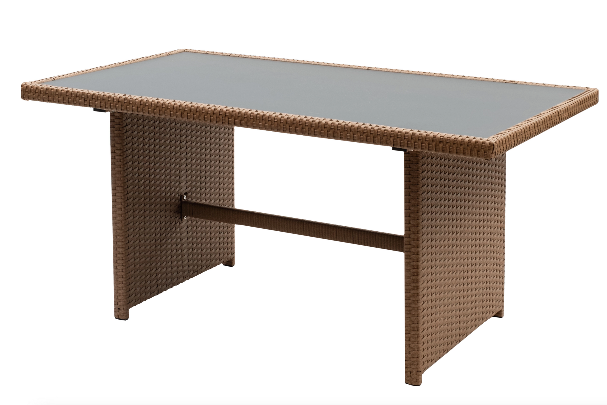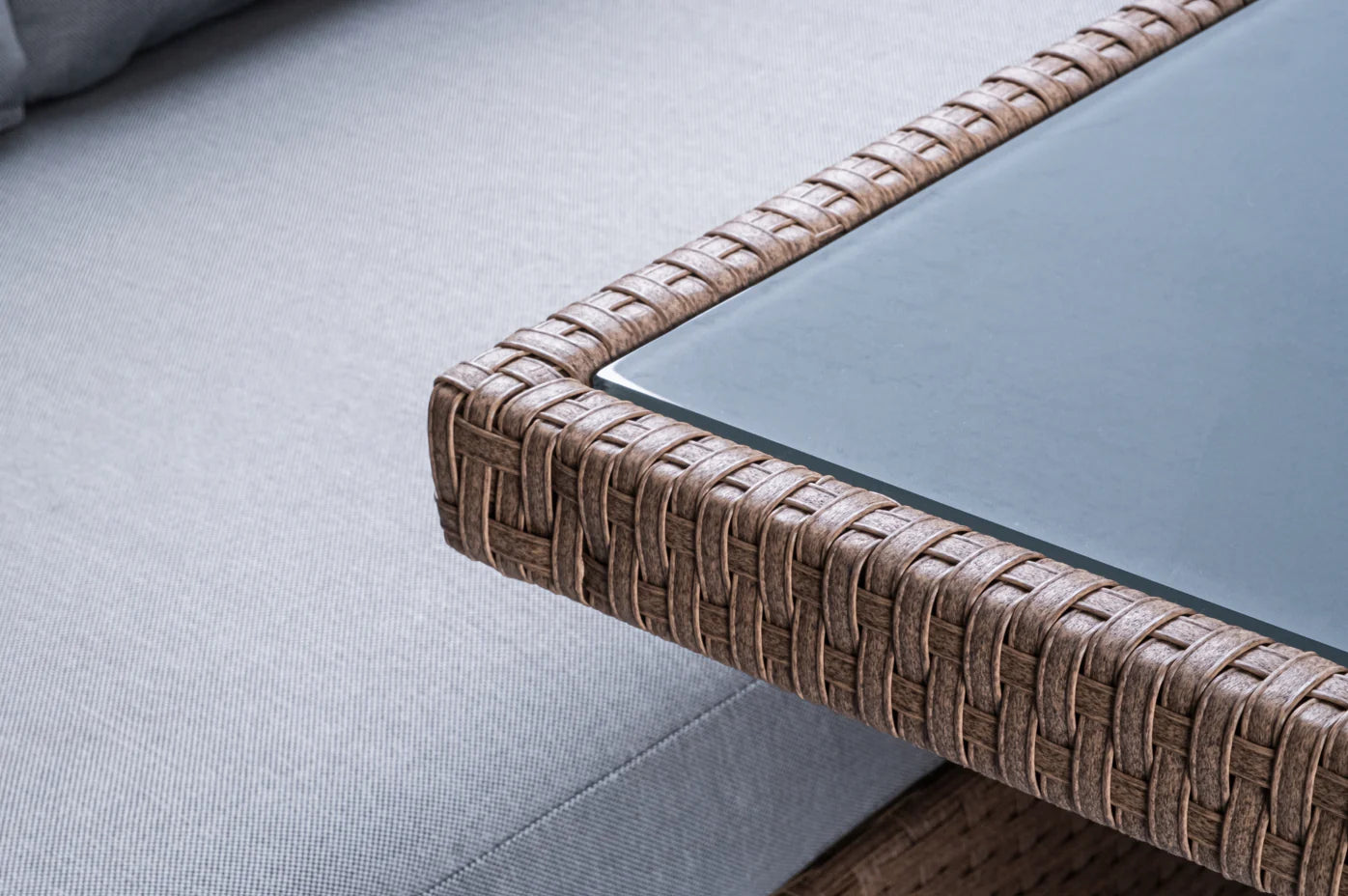 Kavos staliuko medžiaga – technoratanas, apvyniotas aplink plieną su grūdinto stiklo stalviršiumi.