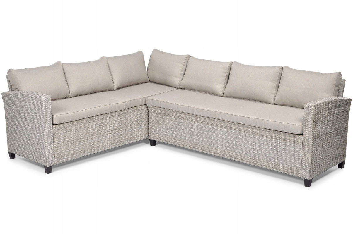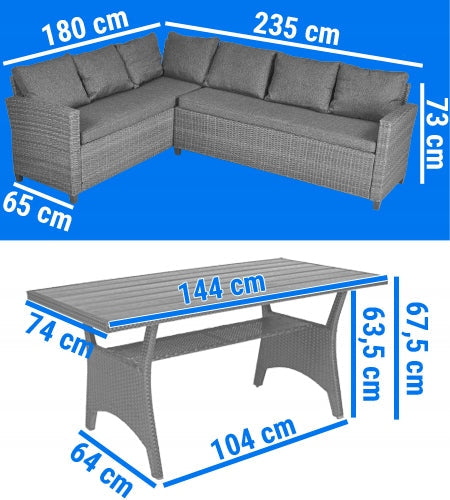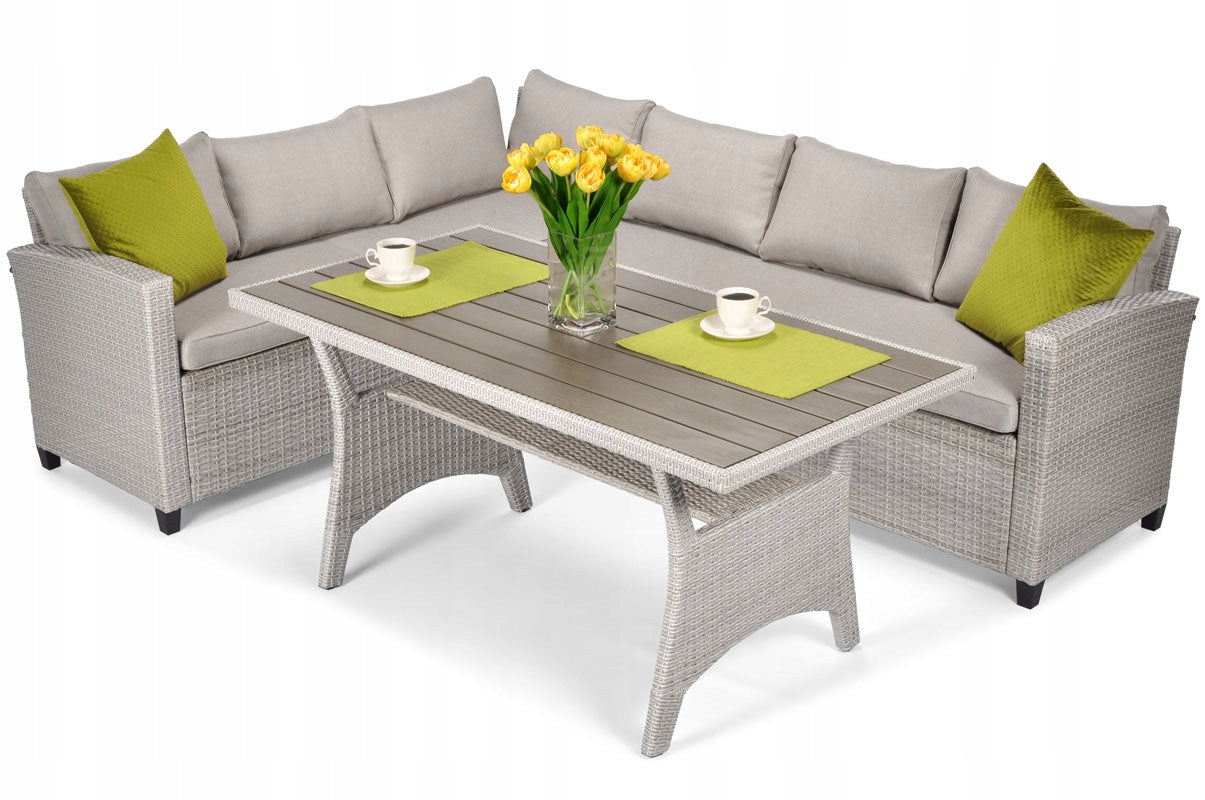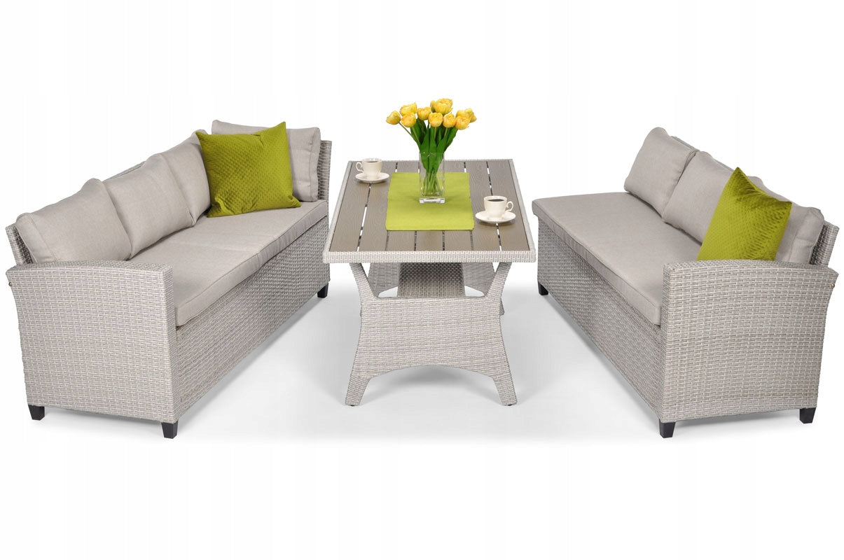 Komplektą sudaro: sodo kampinė sofa (arba dvi 3-vietės sofos), didelis pietų stalas, atlošas ir sėdynės pagalvėlės.