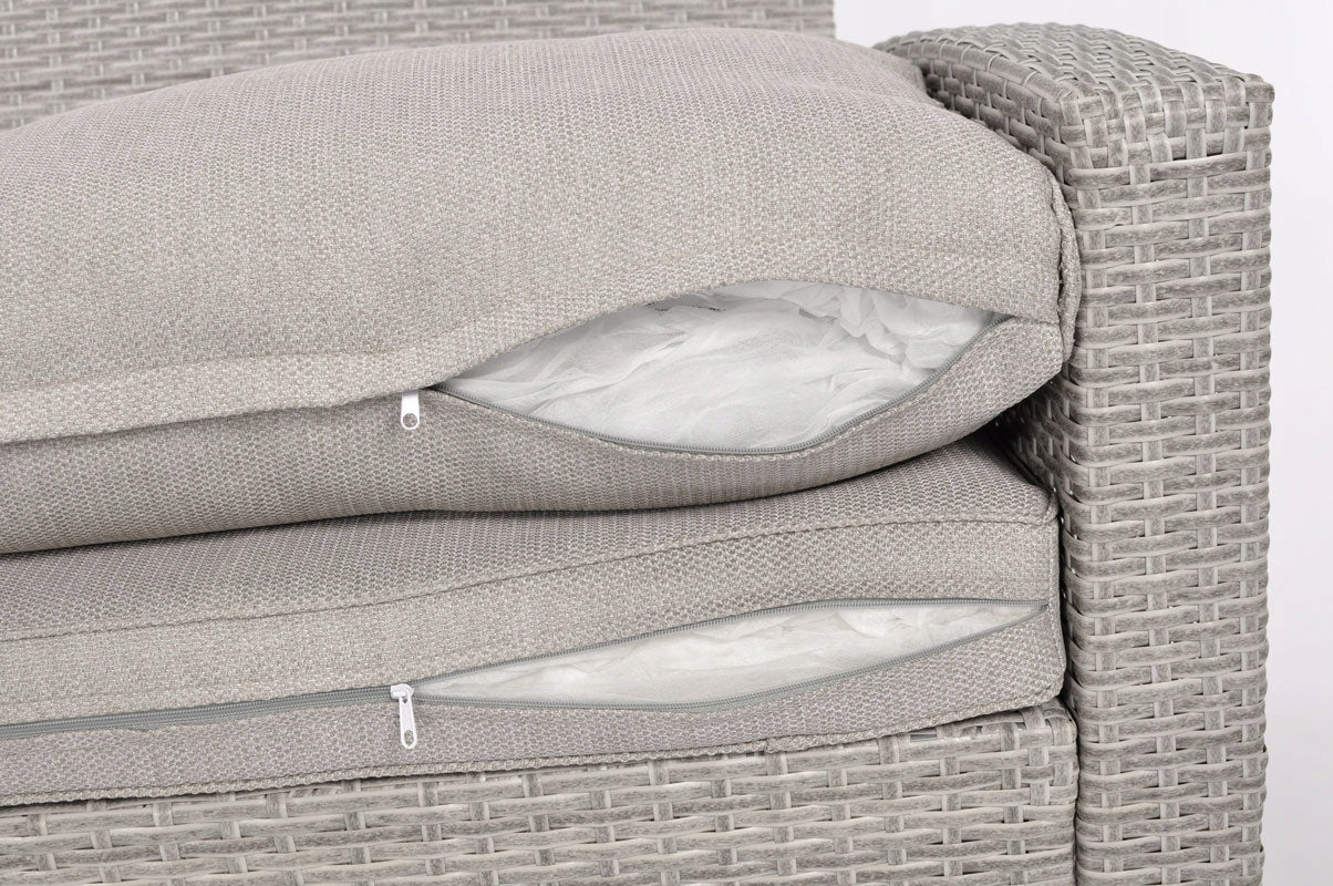 Pagalvės turi nuimamus užvalkalus su užtrauktuku , kuriuos galima skalbti skalbimo mašinoje. Jie pagaminti iš aukštos kokybės poliesterio ir puikiai tinka naudoti lauke. Pagalvėlės yra 7 cm storio (sėdimoji dalis) ir 18 cm (atlošas).