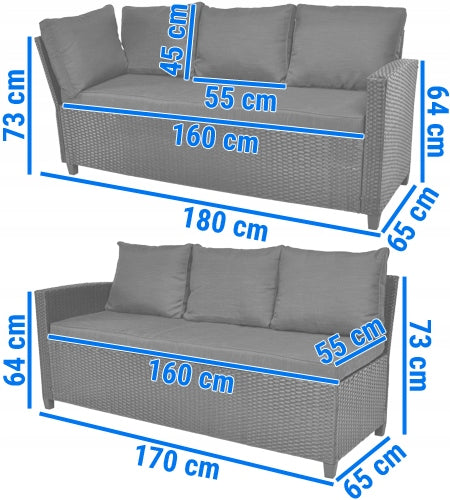 Į komplektaciją įeina: sodo stalas, kampinė sofa (arba 3-vietė sofa x 2 vnt), ilga sėdynė x 2 vnt, atlošo pagalvėlė x 7 vnt.