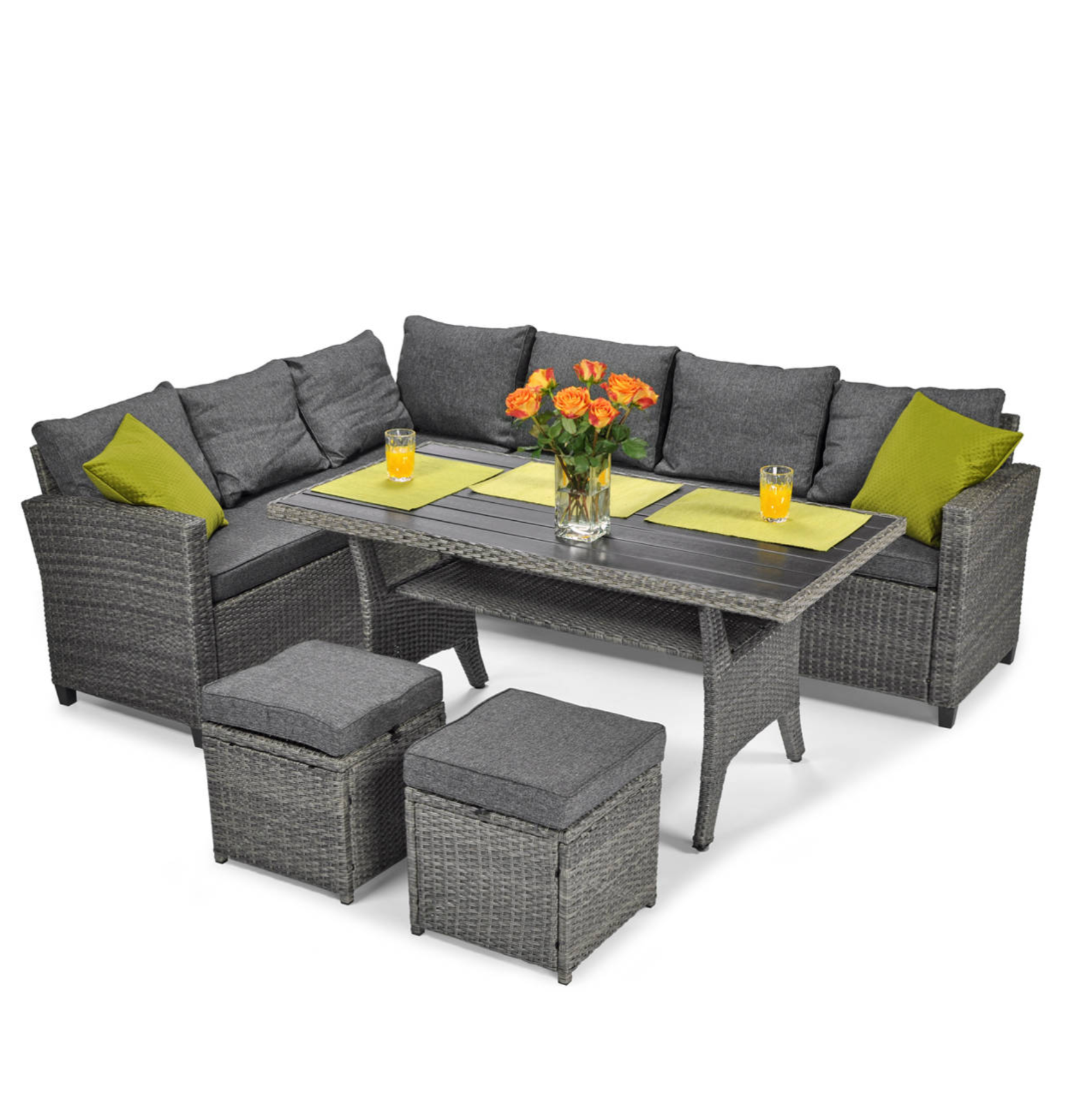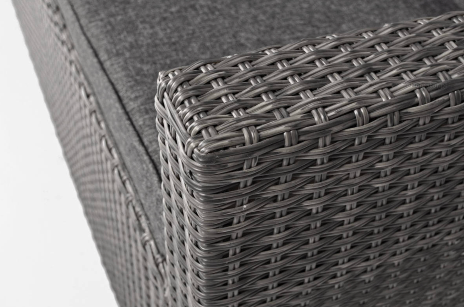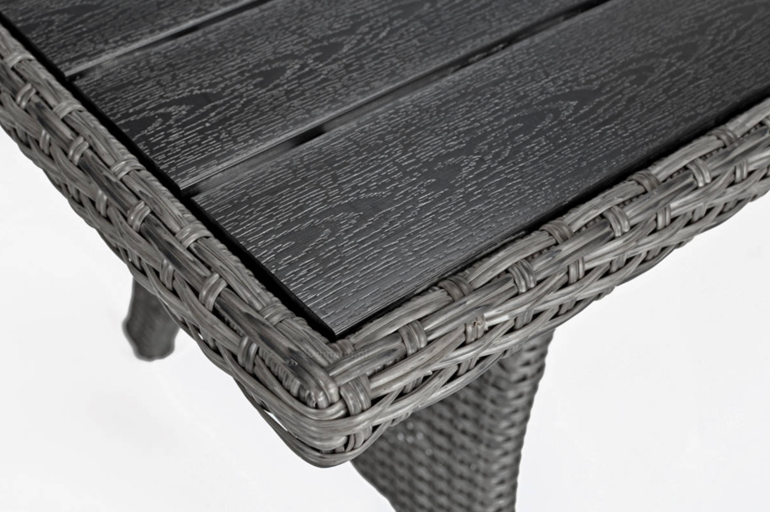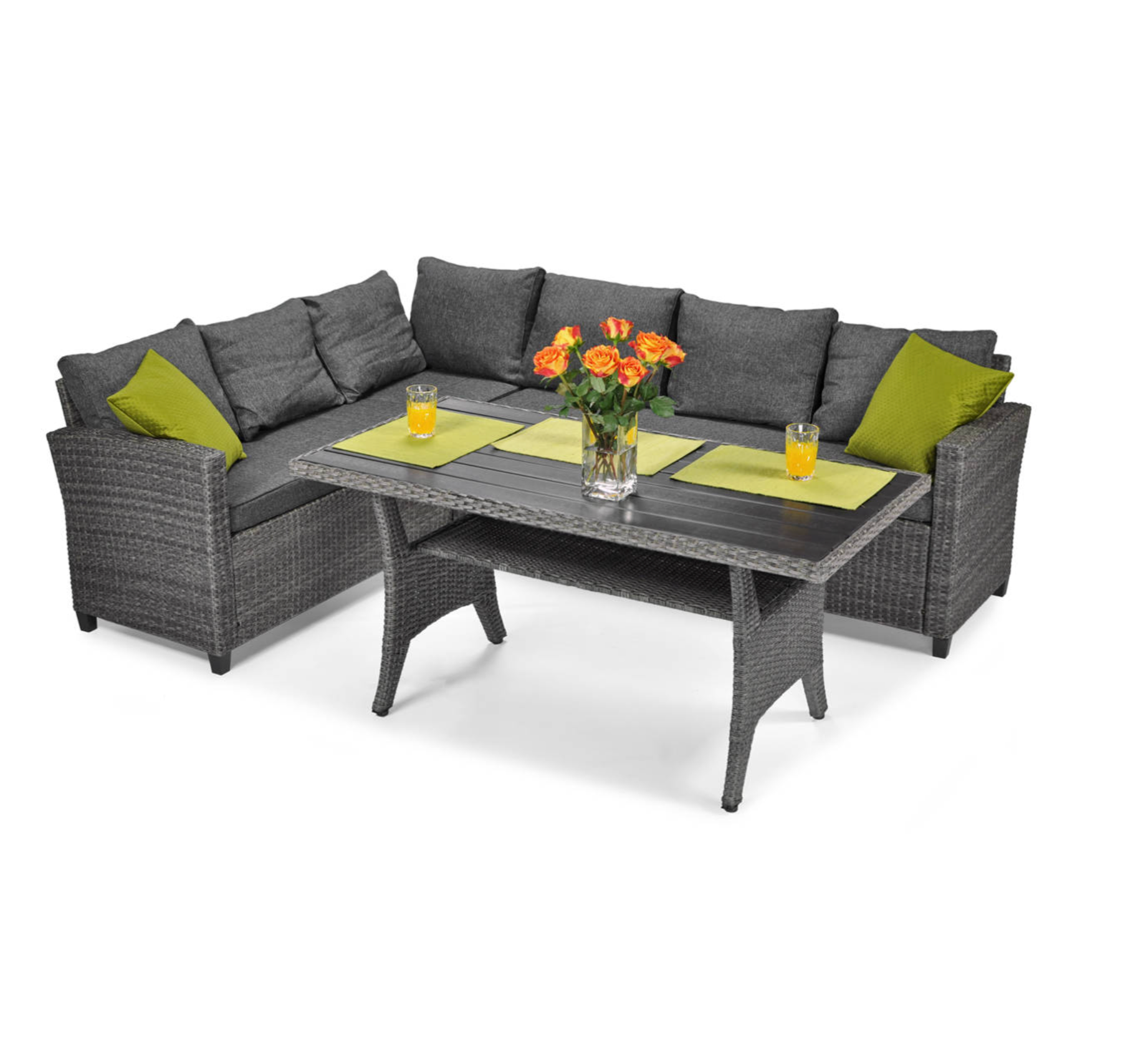 Elegantiškas STOCKHOLM sodo baldų komplektas puikiai tiks terasai ar dideliam balkonui. Universali kampinė sofa gali būti dedama iš kairės arba dešinės pusės, o aukštas stalas pravers pietaujant. Gražus komplektas iš kokybiško grafito spalvos technorotano 8 asmenims. Tamsintos juodos, grafito ir pilkos spalvos technorotano juostelės persipina viena su kita, suteikdamos natūralų efektą.