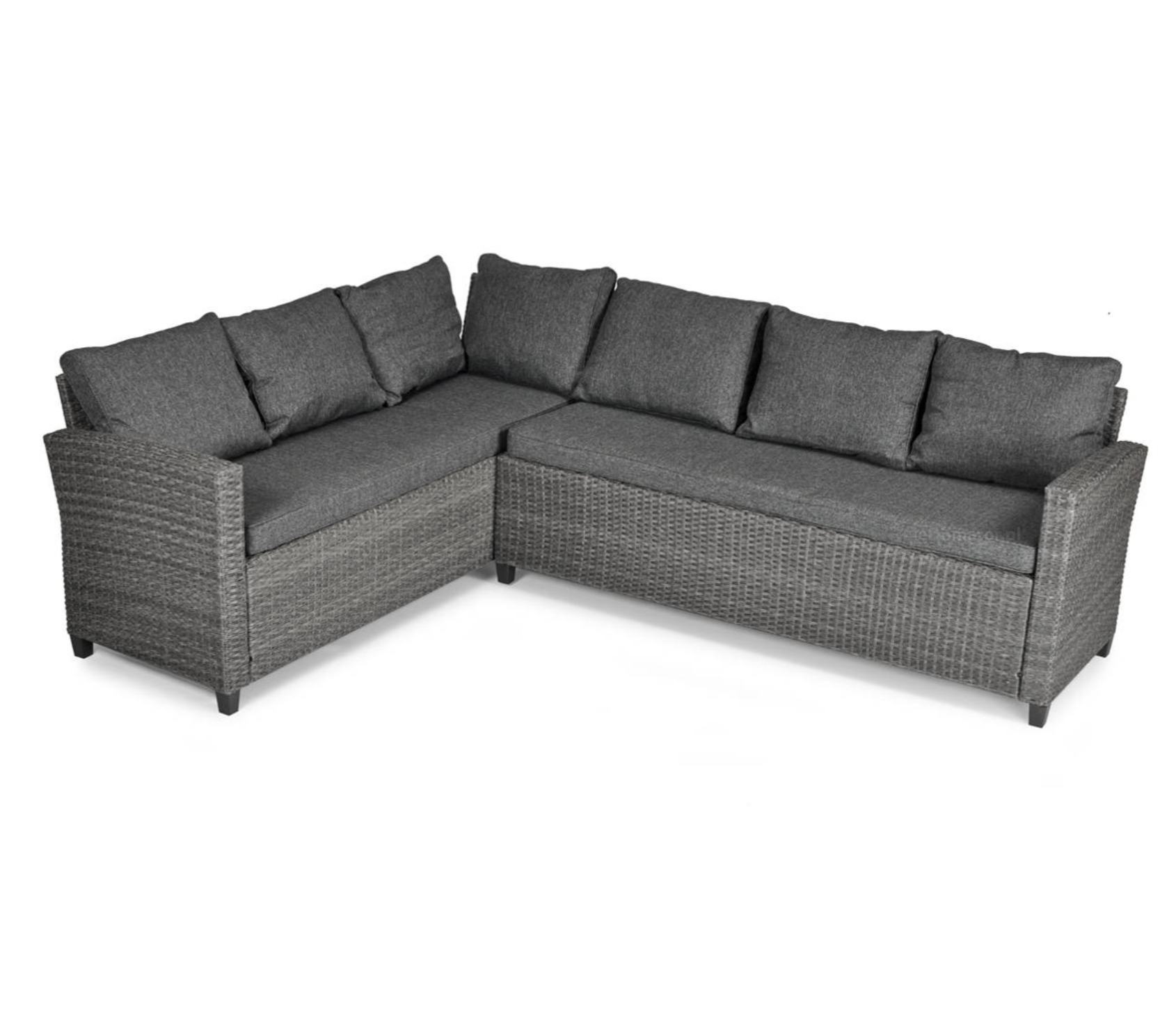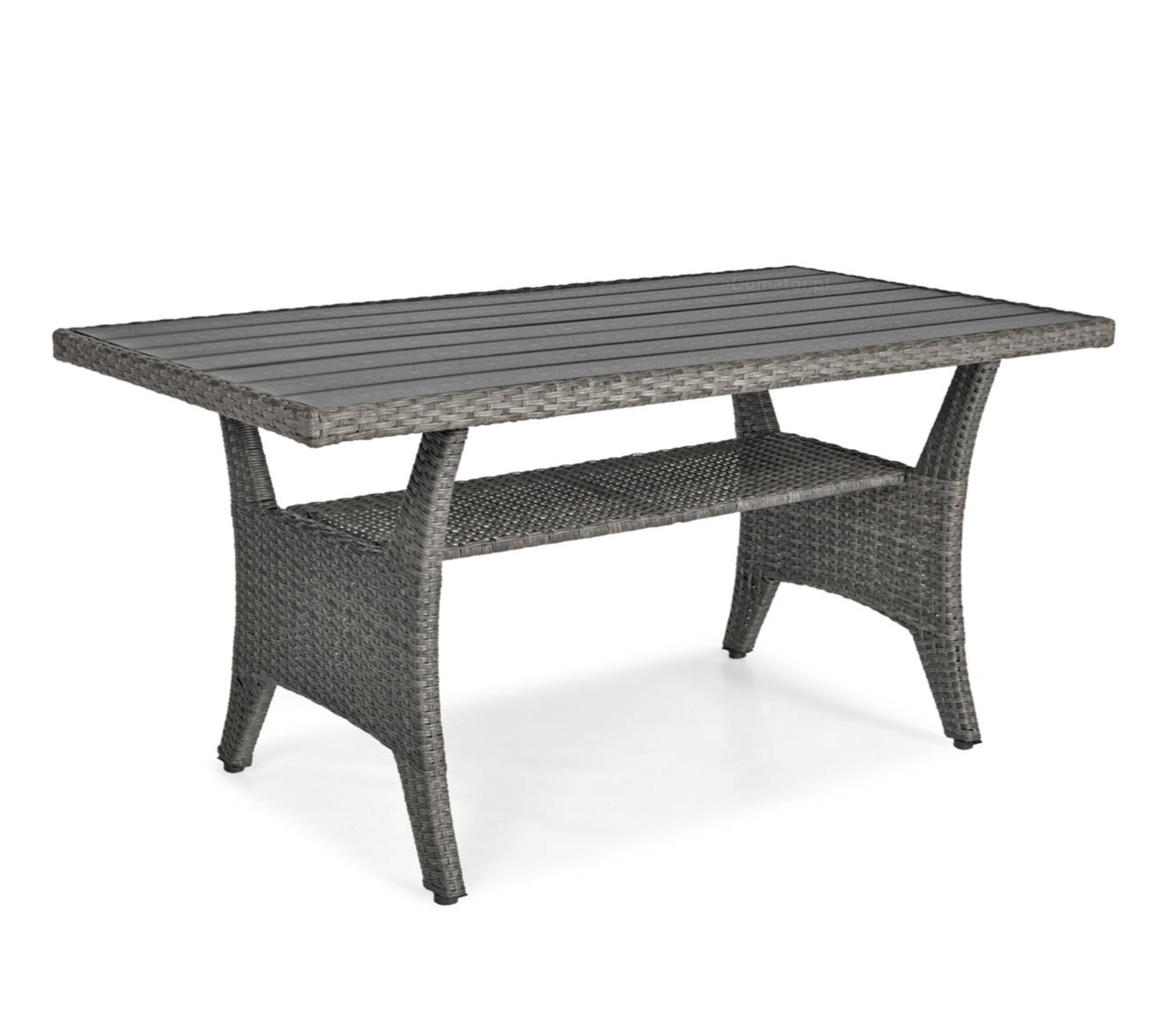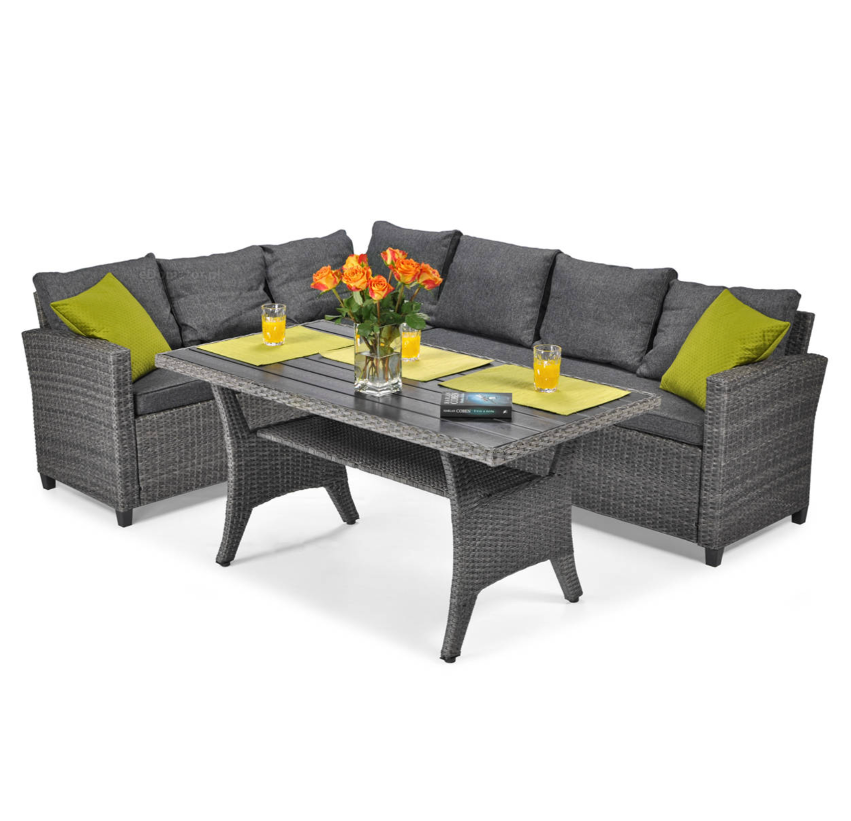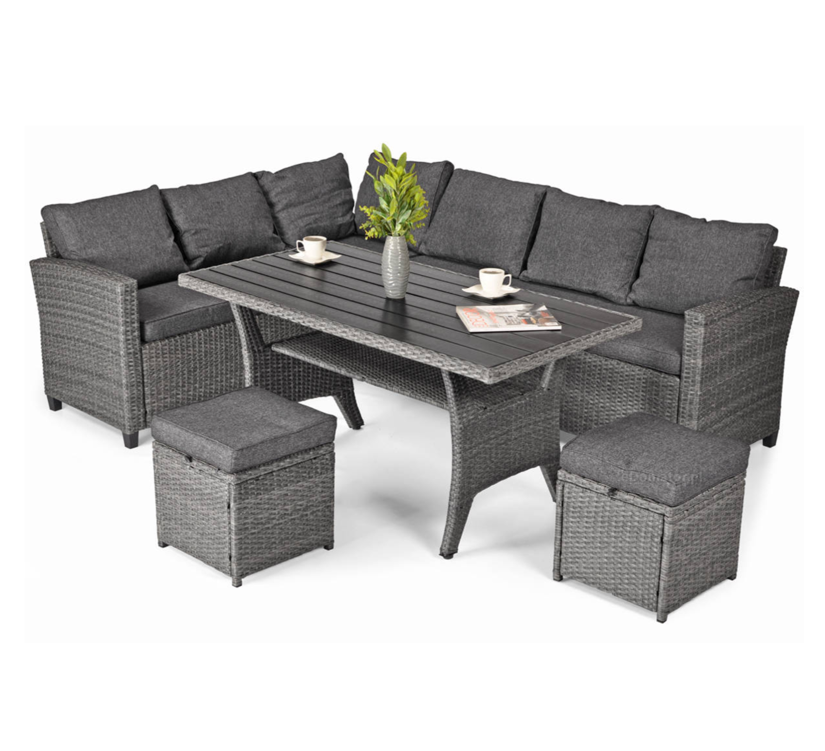 Elegantiškas STOCKHOLM sodo baldų komplektas puikiai tiks terasai ar dideliam balkonui. Universali kampinė sofa gali būti dedama iš kairės arba dešinės pusės, o aukštas stalas pravers pietaujant. Gražus komplektas iš kokybiško grafito spalvos technorotano 8 asmenims. Tamsintos juodos, grafito ir pilkos spalvos technorotano juostelės persipina viena su kita, suteikdamos natūralų efektą.
