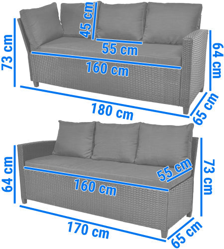 Kampinė sofa gali būti padalinta į dvi 3-vietes sofas, kurių matmenys: 180 x 65 x 73 ir 170 x 65 x 73 cm,