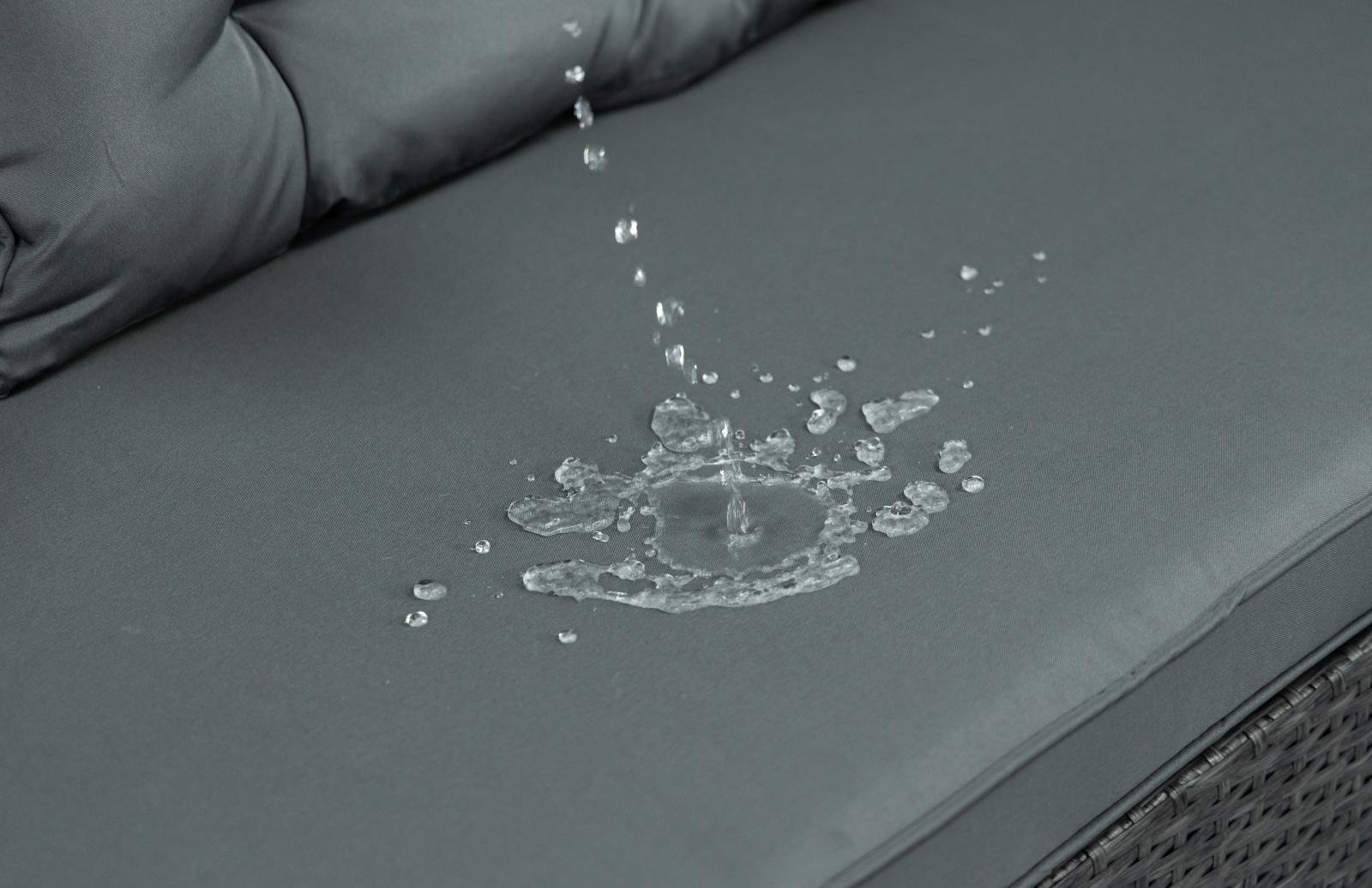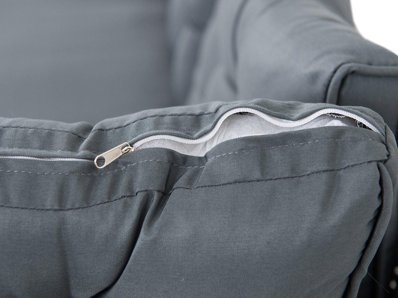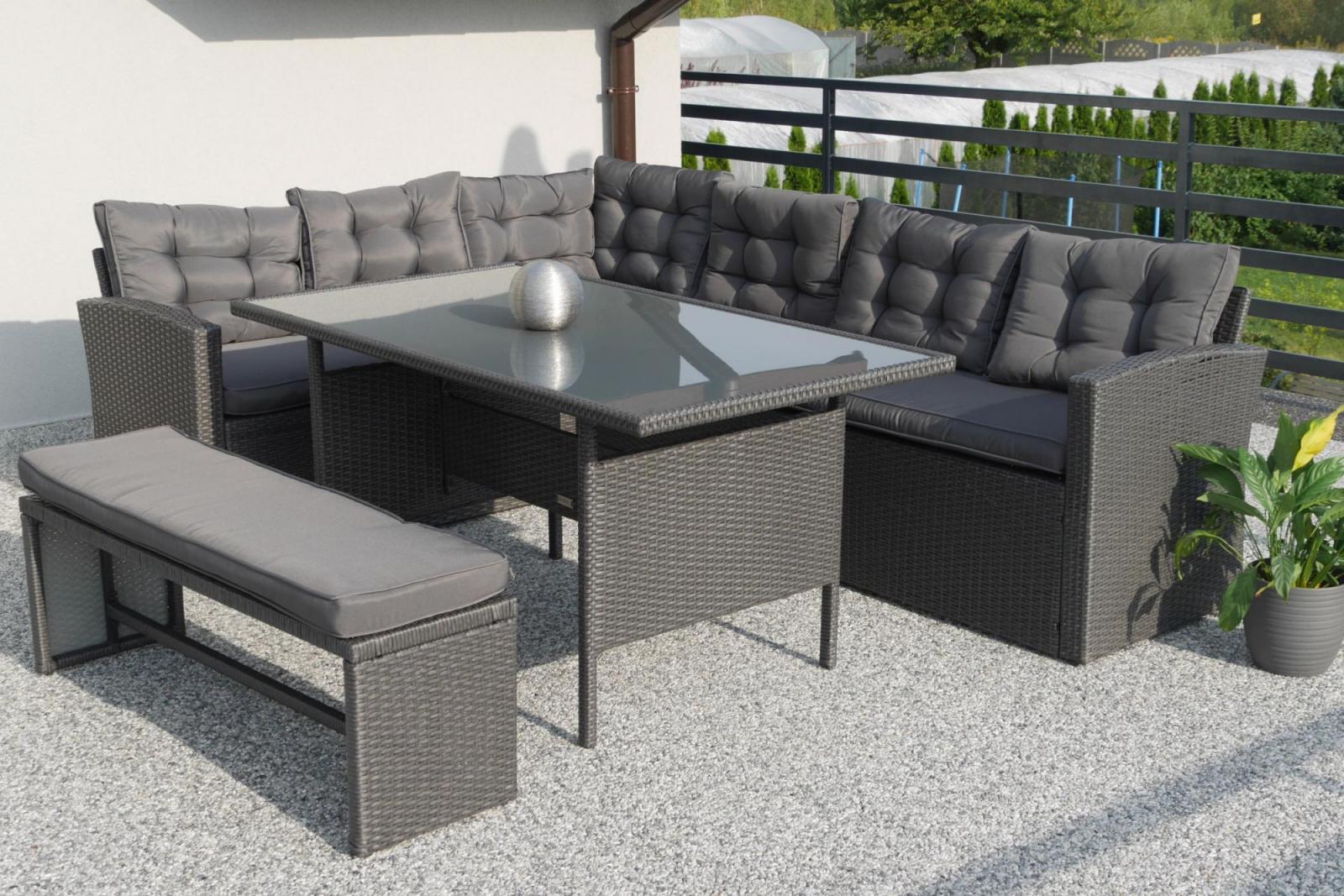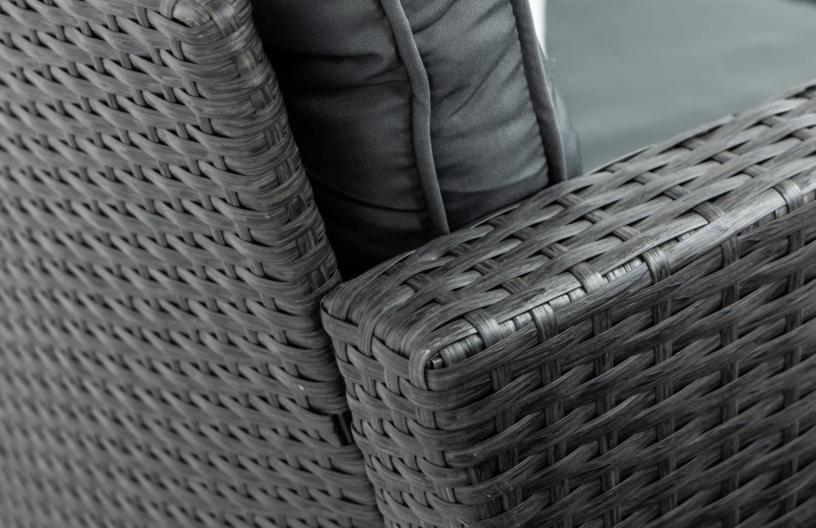 Sodo baldai iš polirotango pagaminti iš šviesių grafito atspalvių. Pintinė nelygi, o lygios sėdynės pagalvėlės ir dygsniuotos atlošo pagalvėlės sukuria labai tvarkingą komplektą.
