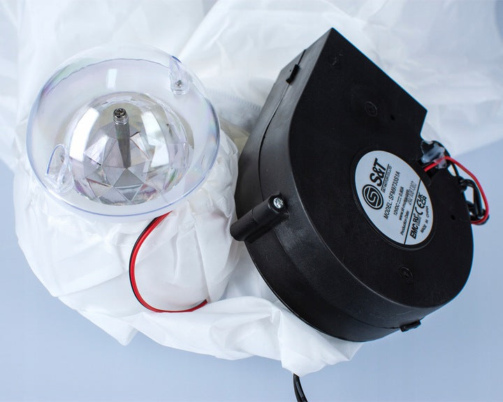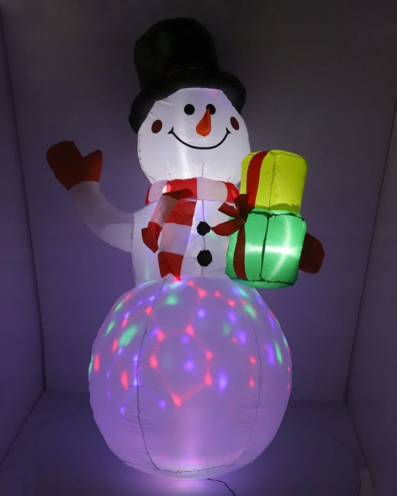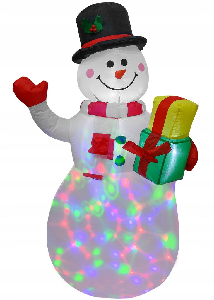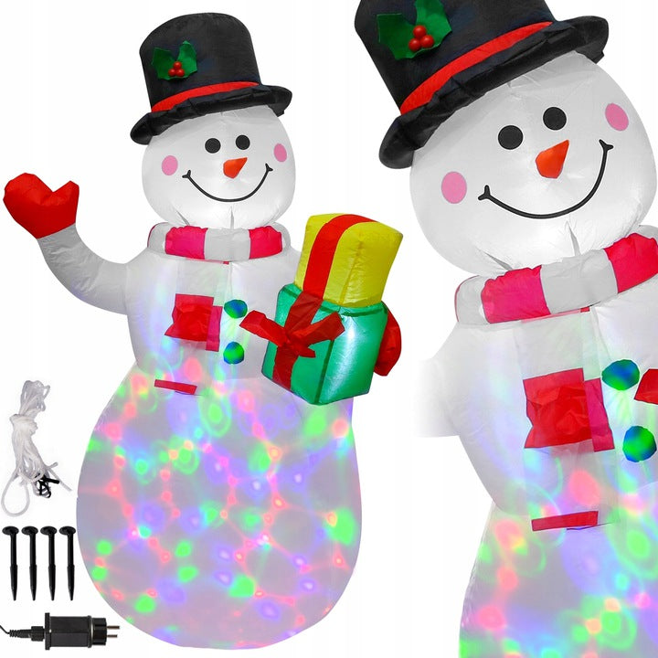 Sniego senis turi įmontuotą kompresorių, kuris užpildo jį oru. Papildomai yra įmontuotas besisukantis LED projektorius, kuris jį apšviečia iš vidaus. Sutemus sniego senis mirga daugybe spalvų.