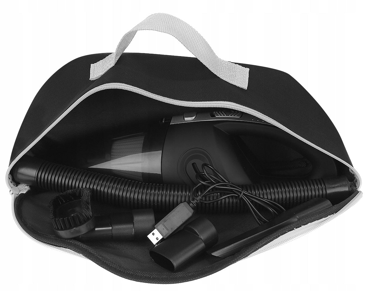Praktiškas dėklas su rankena leis patogiai laikyti ir transportuoti dulkių siurblį su visais komplekte esančiais priedais.