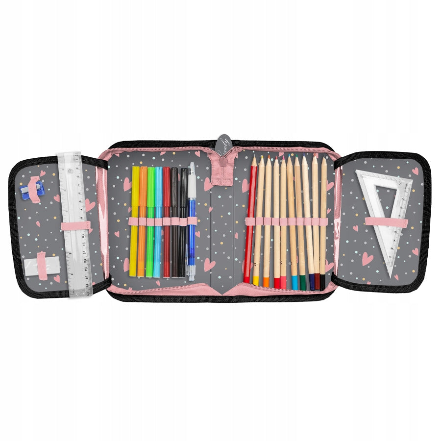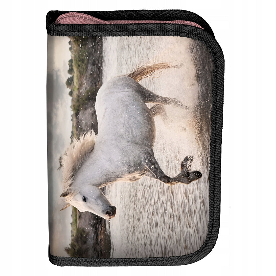 Mokyklinis pieštukų dėklas su aksesuarais iš naujausios PASO KOŃ kolekcijos. Pieštukų dėklas yra vienos kameros su spalvingu interjeru ir turi du atvartus su priedais. Viduje rasite: