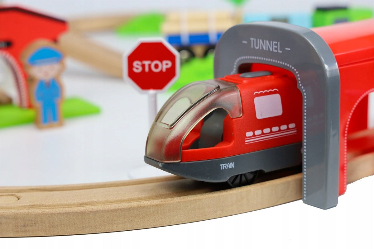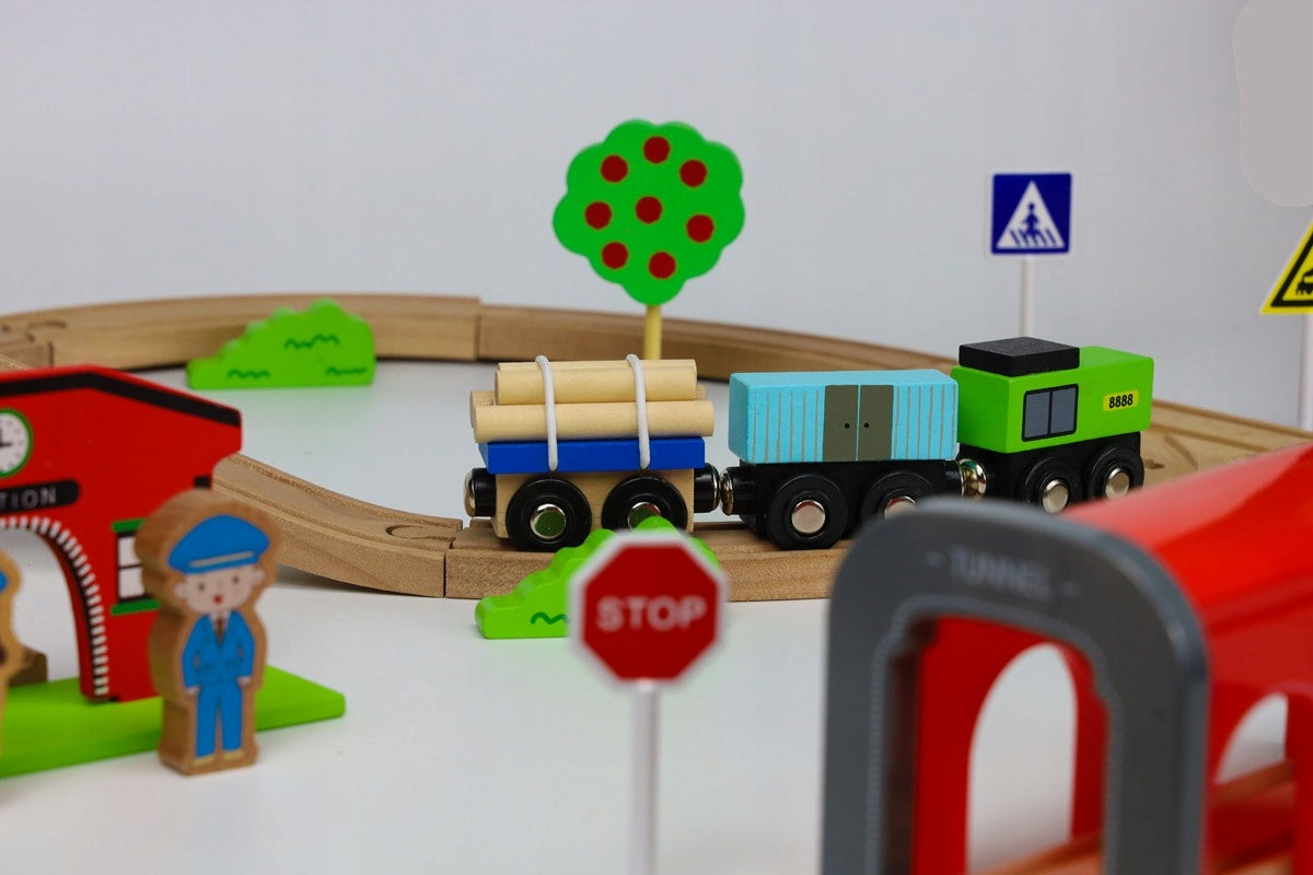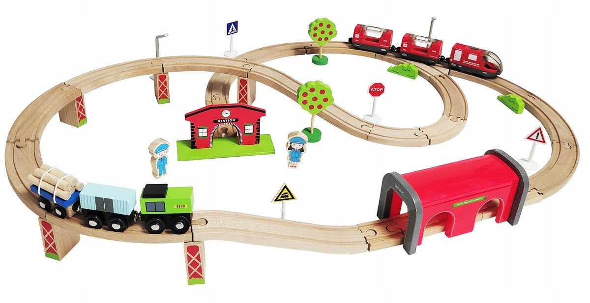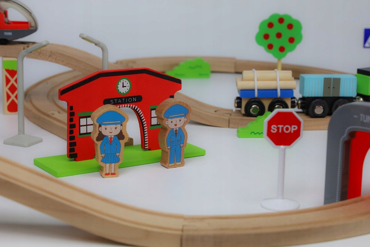 Įspūdingo 320 cm ilgio medinių traukinio bėgių rinkinys suteikia neribotas galimybes kurti įvairias konfigūracijas. Dėl to jūsų vaikas gali eksperimentuoti, planuoti ir kurti savo maršrutus su nesibaigiančiais praėjimais ir tuneliais. Tai daugiau nei malonumas, tai tikras iššūkis mažajam konstruktoriui.