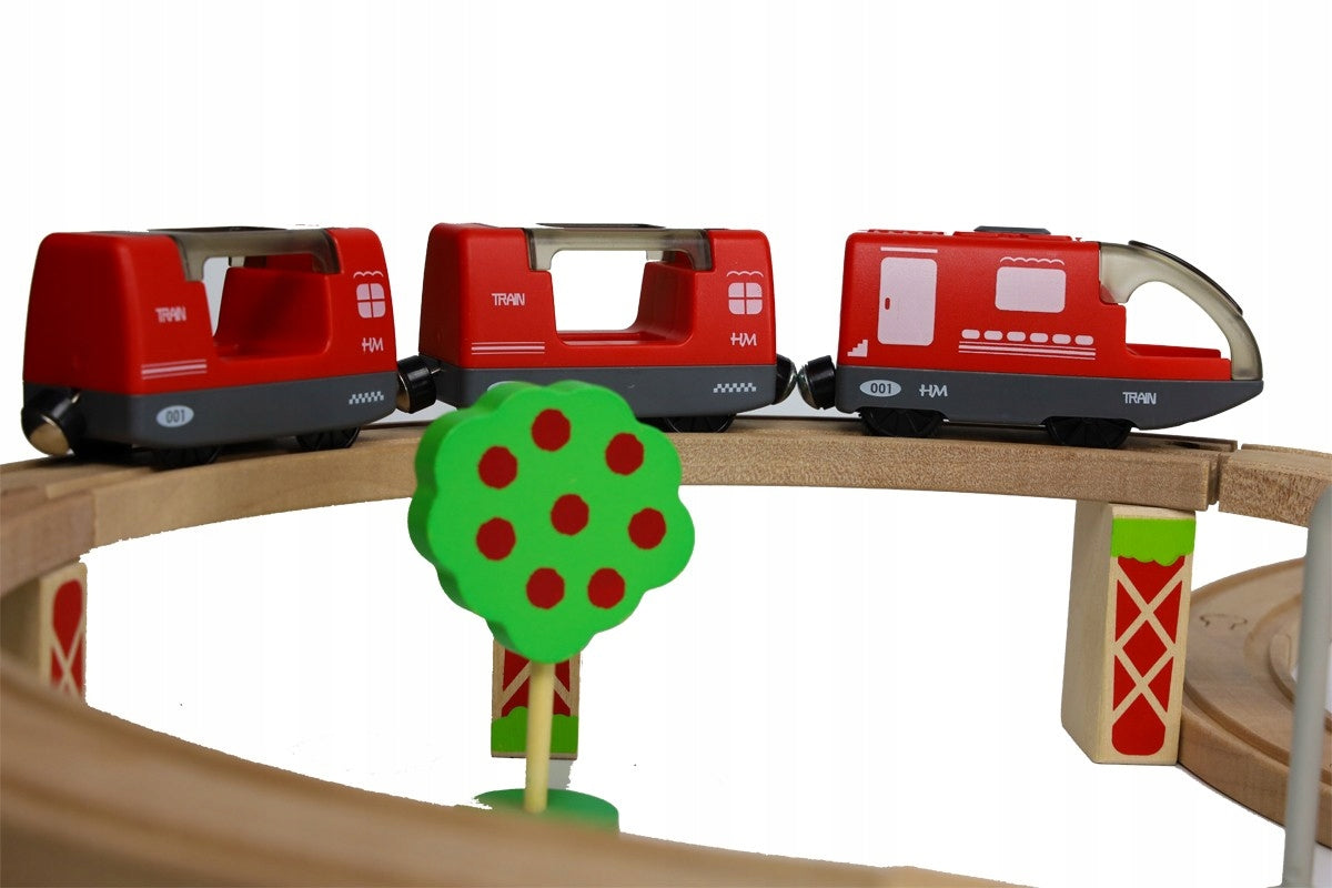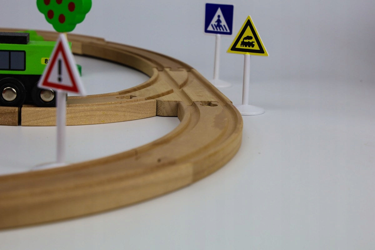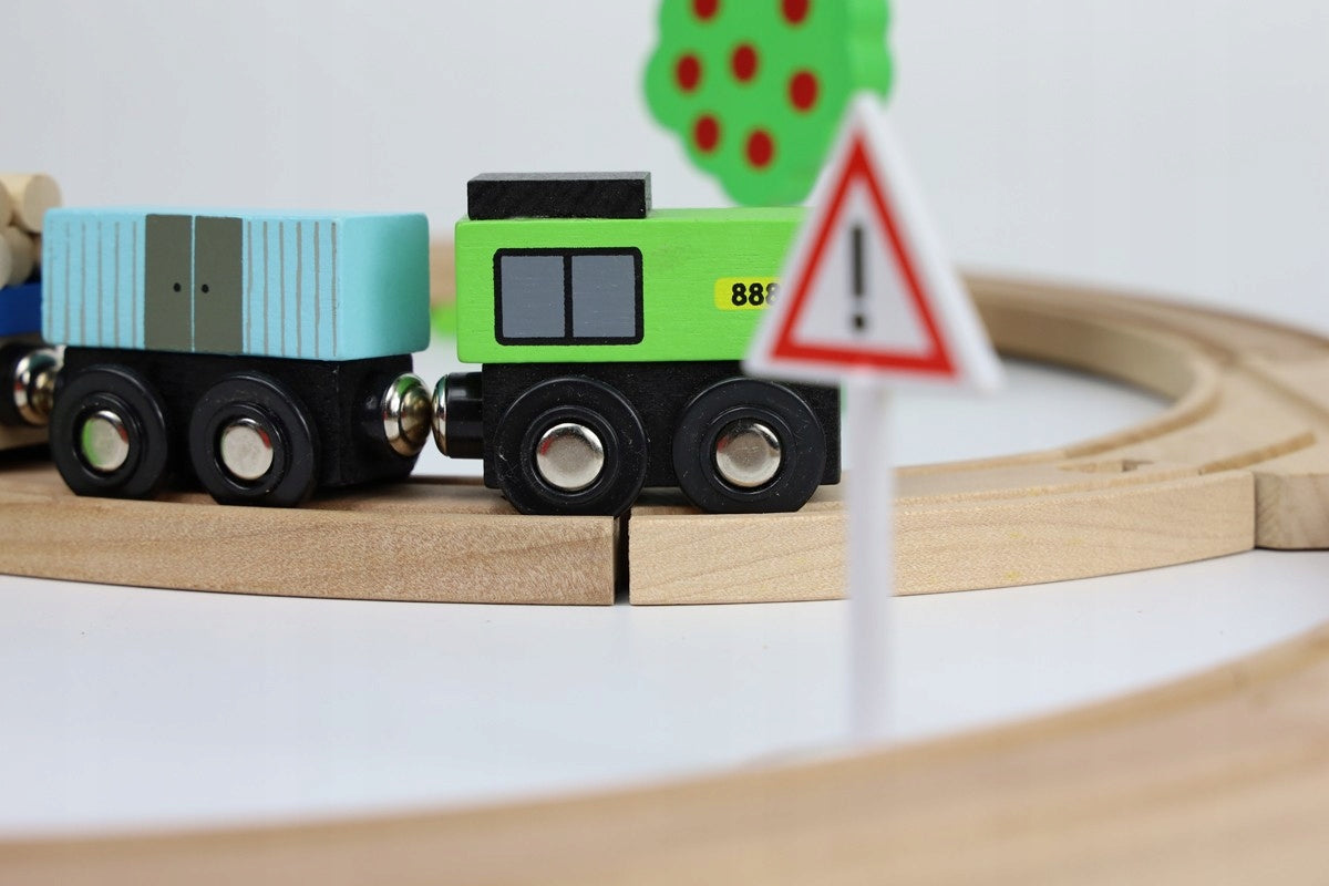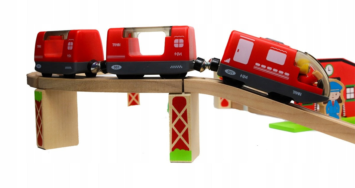 Rinkinį sudaro 20 medinių vikšrų, medinės kaladėlės, žmonių figūrėlės, magnetiniai vagonai, raudonas baterijomis varomas lokomotyvas. Visi elementai yra kruopščiai pagaminti ir saugūs vaikams.