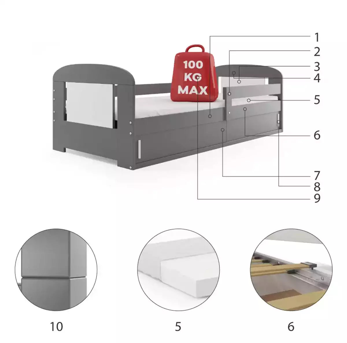 Čiužinys - 160x80x7 dydžio, su nuimamu užvalkalu, kondicionavimo pluoštu ir poliuretano putomis. Užvalkalas - dygsniuotas hipoalerginis audinys, pagamintas iš poliesterio, su užtrauktuku.