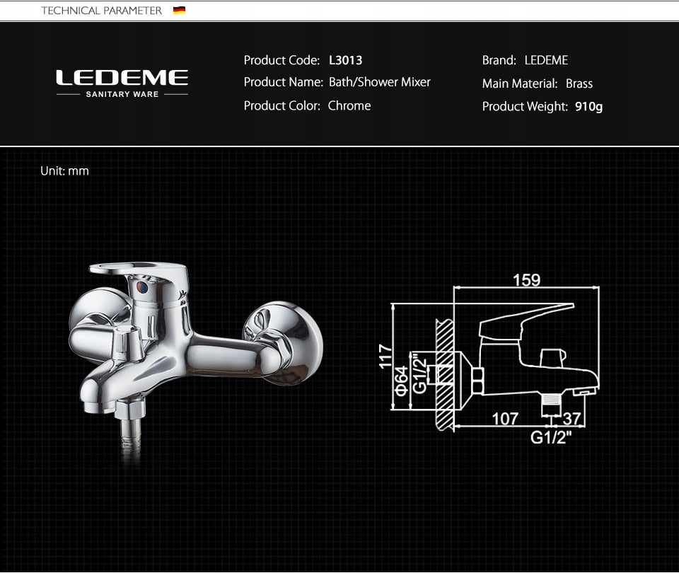 Sieninis vonios ir dušo maišytuvas Ledeme, chromas