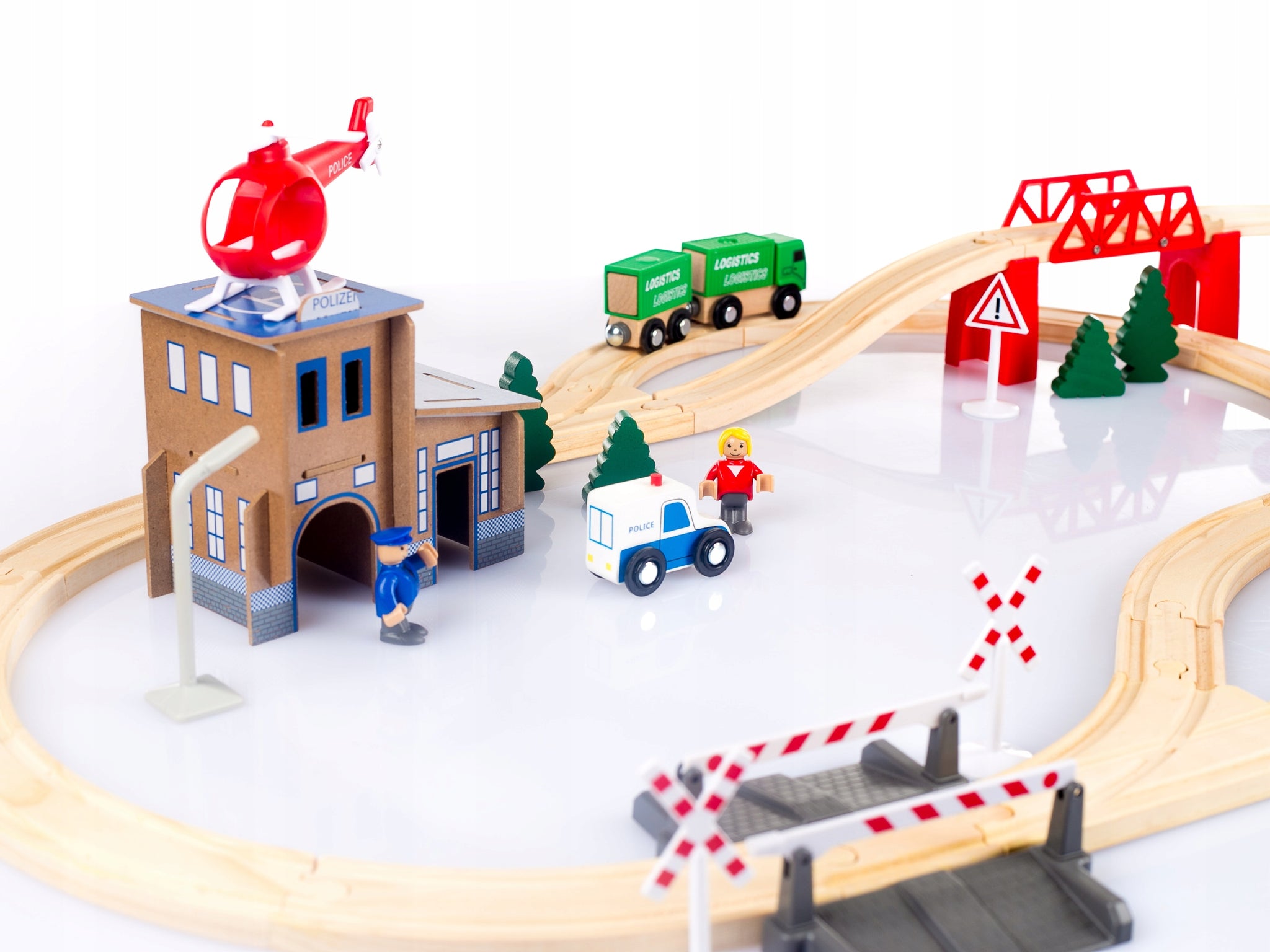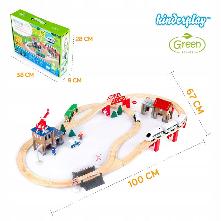 Medinis geležinkelis su policijos komisariatu. 80 elementų rinkinys. Visumą sudaro daugybė įdomių elementų, įskaitant transporto priemones, kelio ženklus, medžius, užtvarą ir tiltą. Didelis priedų skaičius reiškia, kad vaikai žais kartu lavindami savo miklumą, rankų ir akių koordinaciją, kūrybiškumą ir vaizduotę.