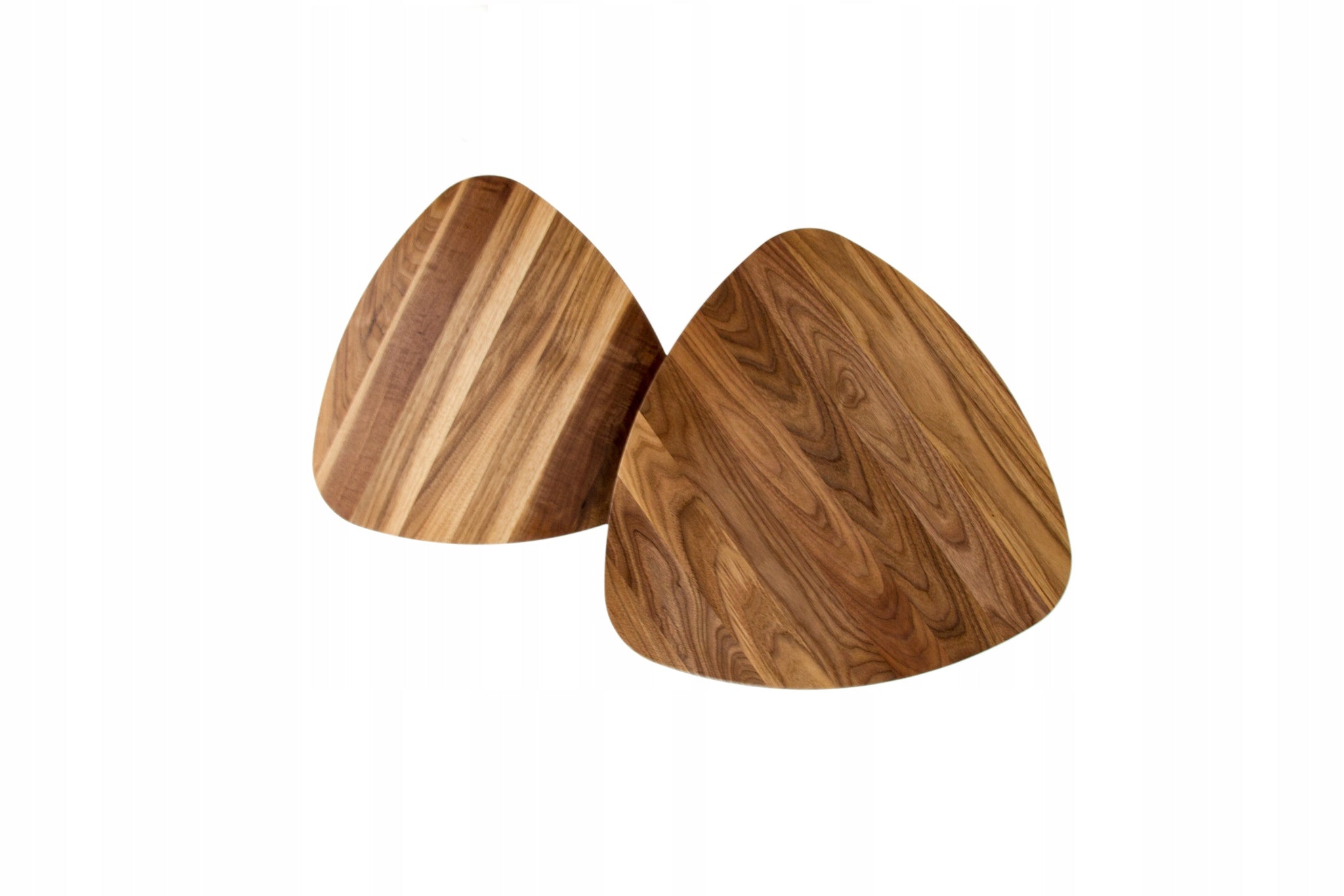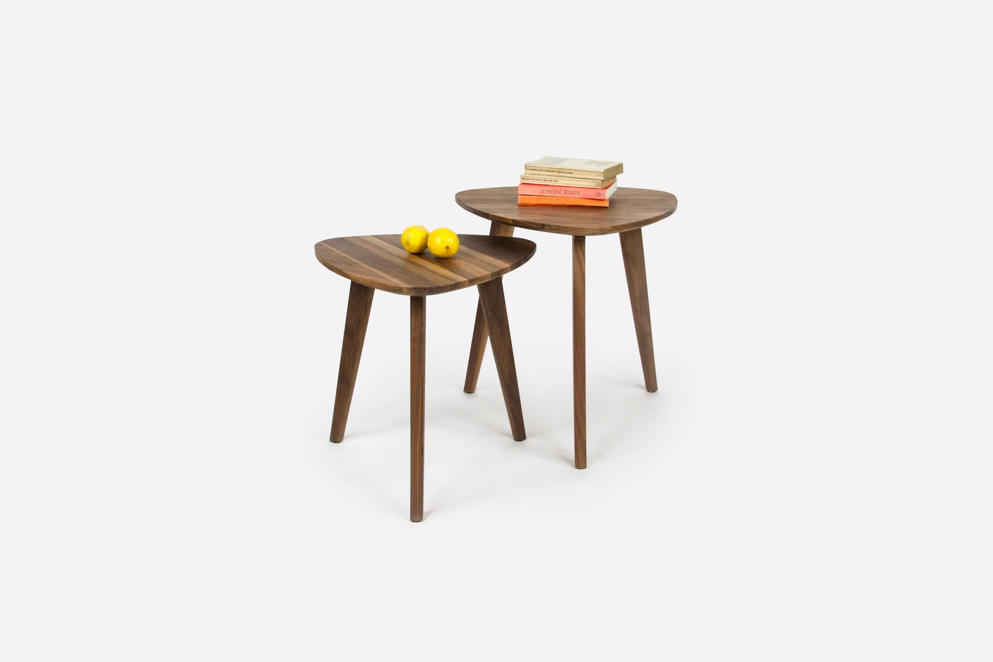 Du trikampiai kavos staliukai pagaminti tik iš kieto amerikietiško riešutmedžio. Puikiai tinka retro ar skandinaviškam interjerui. Mūsų baldai yra apdailinti aukštos klasės alyvomis arba vandens pagrindo lakais, kurie yra saugūs aplinkai.