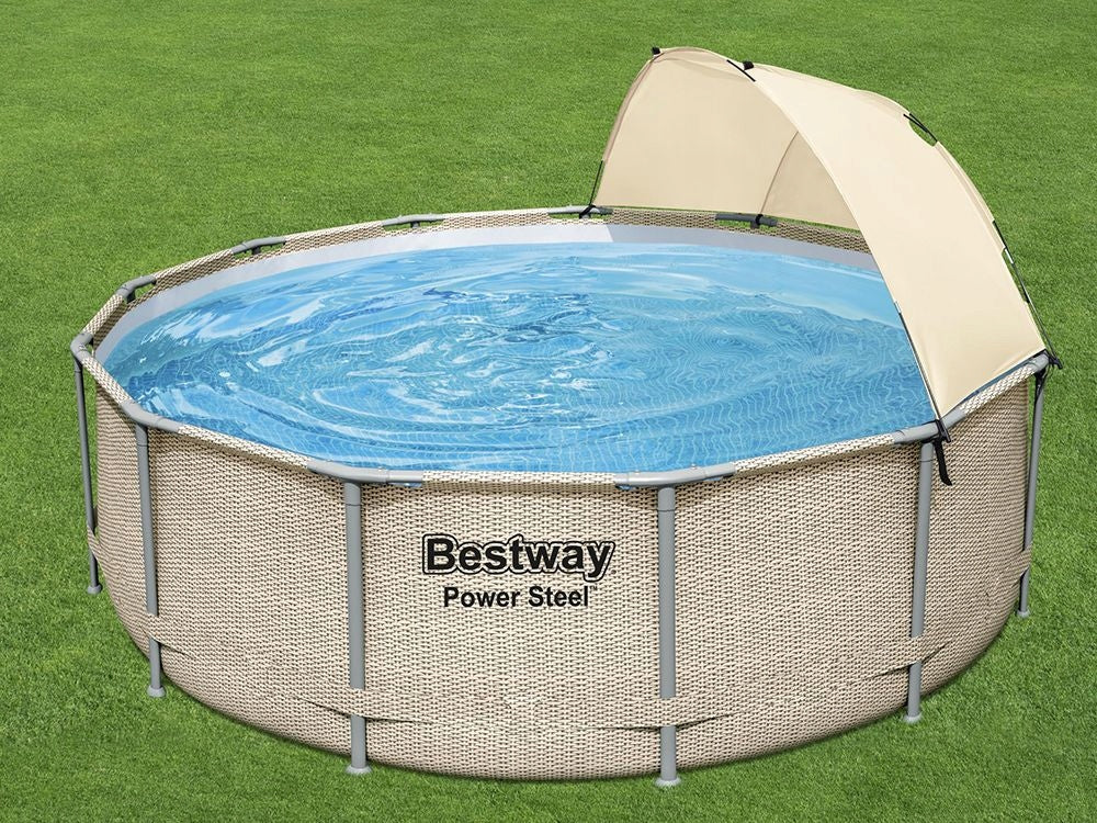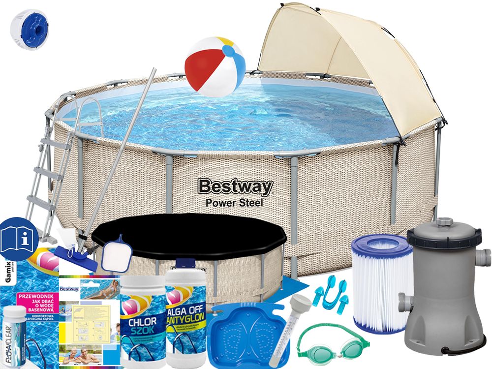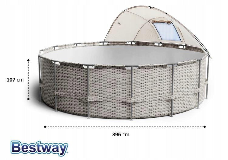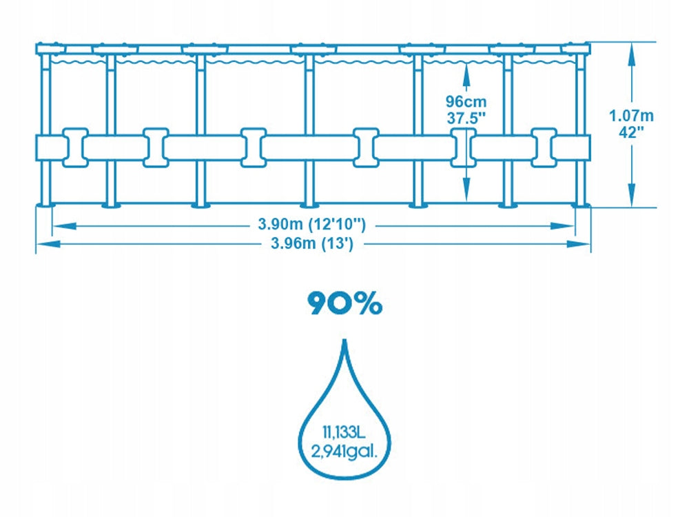RĖMAS BASEINAS - Bestway Power Steel baseinas , dydis Ø 396 cm x 107 cm - talpa 11 133 l Gamintojas nurodo vandens užpildymą, maksimalus 90%.