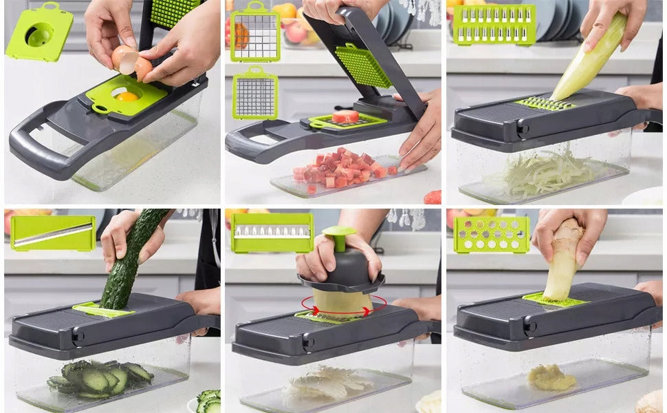 Saugus naudoti. Būkite atsargūs surinkdami arba išardydami daugiafunkcinį daržovių pjaustytuvą ir smulkintuvą. Nenaudokite netinkamų peilių ingredientams pjaustyti, nes priešingu atveju ašmenys gali sulinkti ar net susigadinti. Ergonomiško dizaino daržovių pjaustymo mašina.