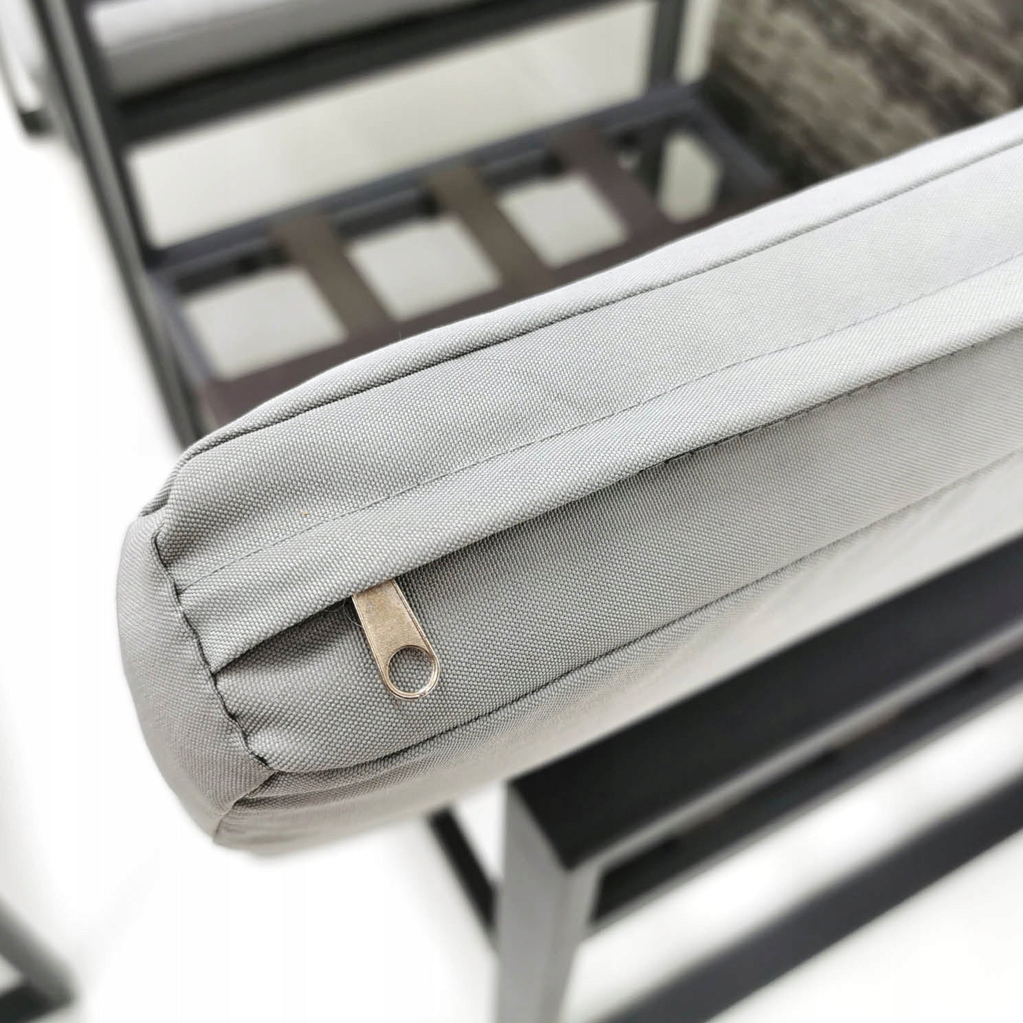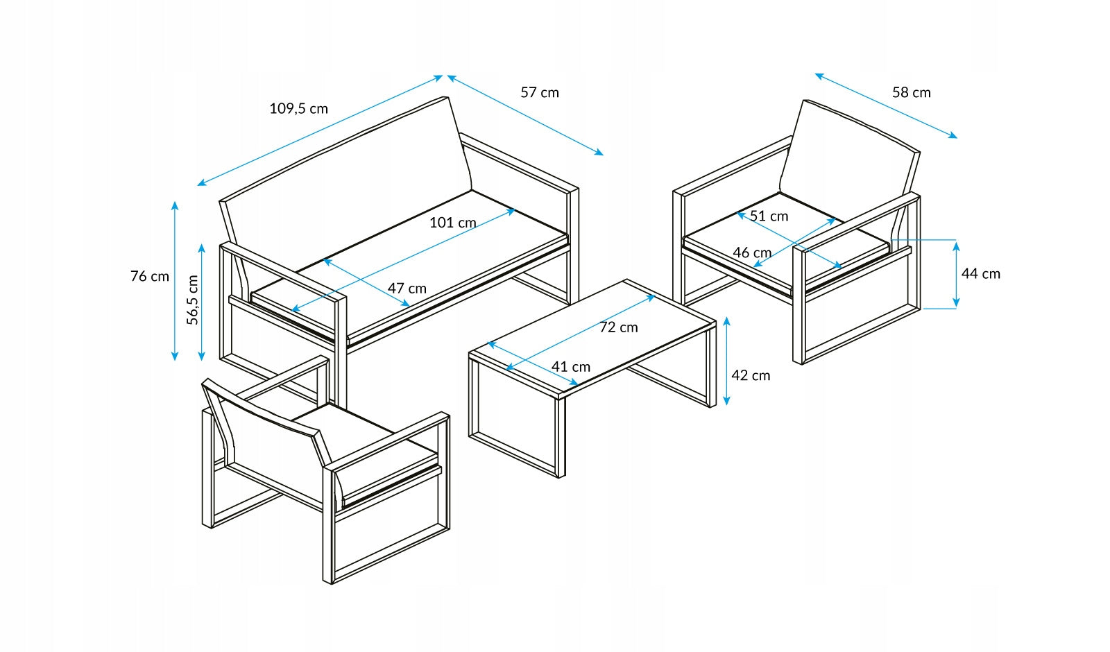 Modernūs, stilingi ir patvarūs metaliniai baldai. Jiems nereikia jokios sudėtingos priežiūros, tereikia minkšto audinio, vandens ar indų ploviklio, kad jie ilgai išliktų geros būklės. Tuo pačiu metu jie yra lengvi ir lengvai. Baldai puikiai tiks lauke, terasose ir pavėsinėje.