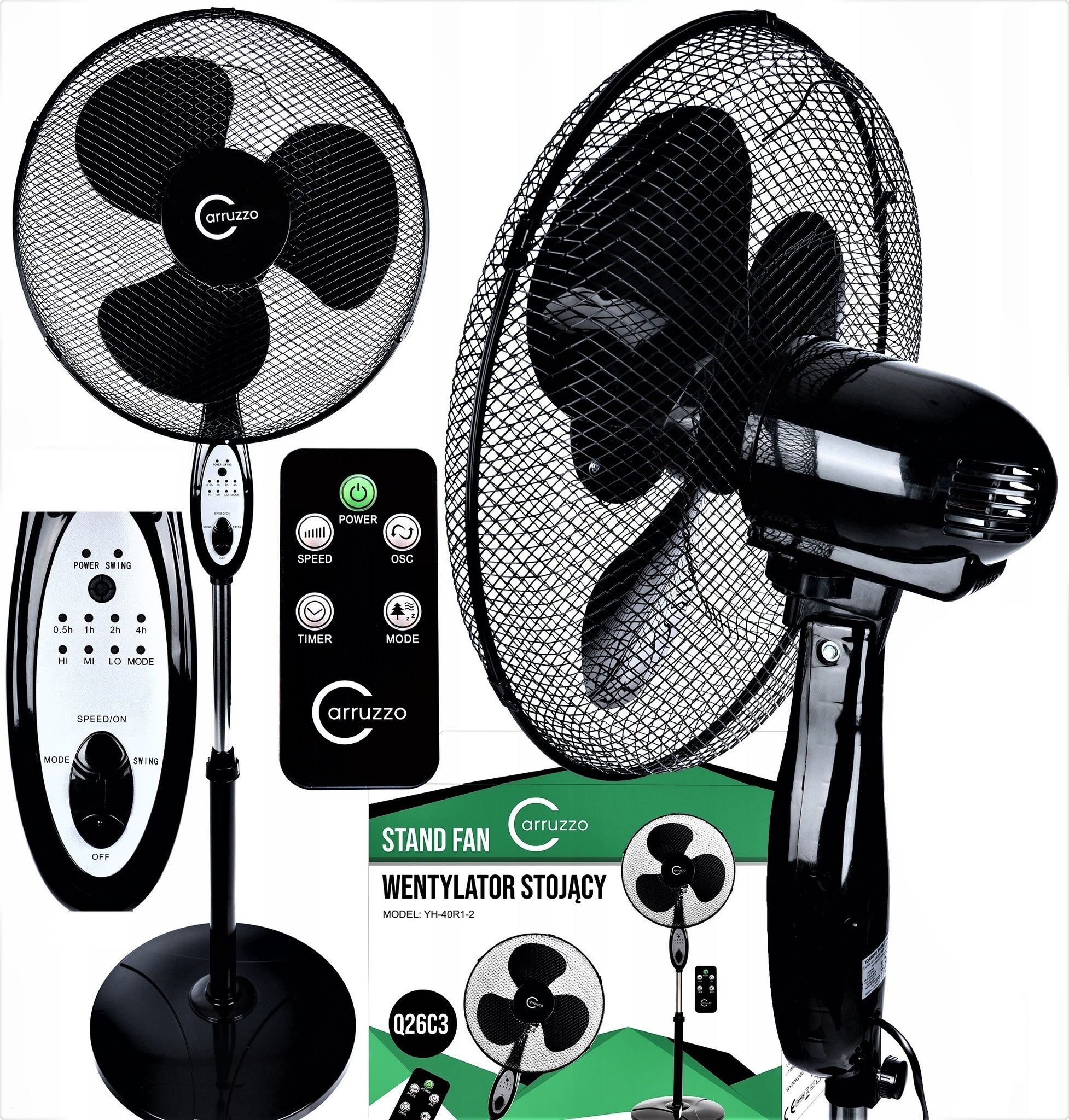4 valdymo skydelio mygtukai: SPEED / ON, OFF, MODE, SWING