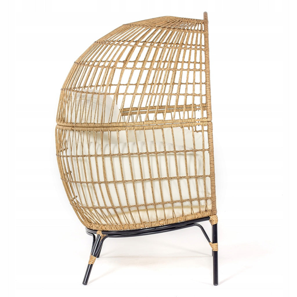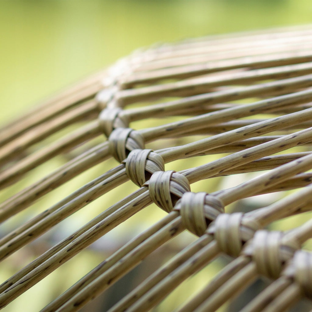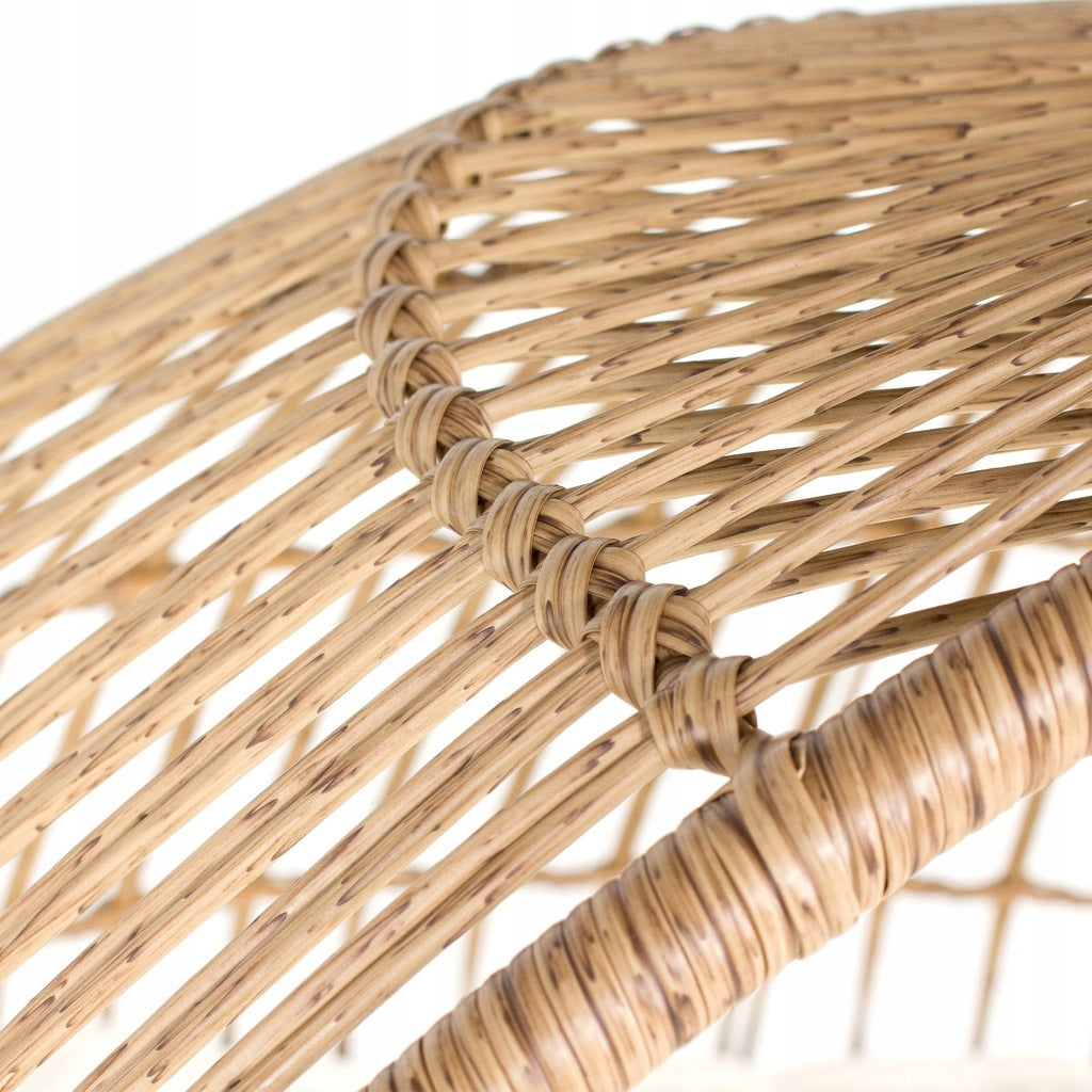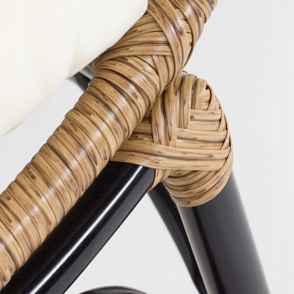 Jo sėdynė ir atlošai pagaminti iš natūralaus atspalvio rotango, dėl kurio kartu su kremine pagalvėlių spalva ALESSIA fotelis atrodo itin elegantiškai.